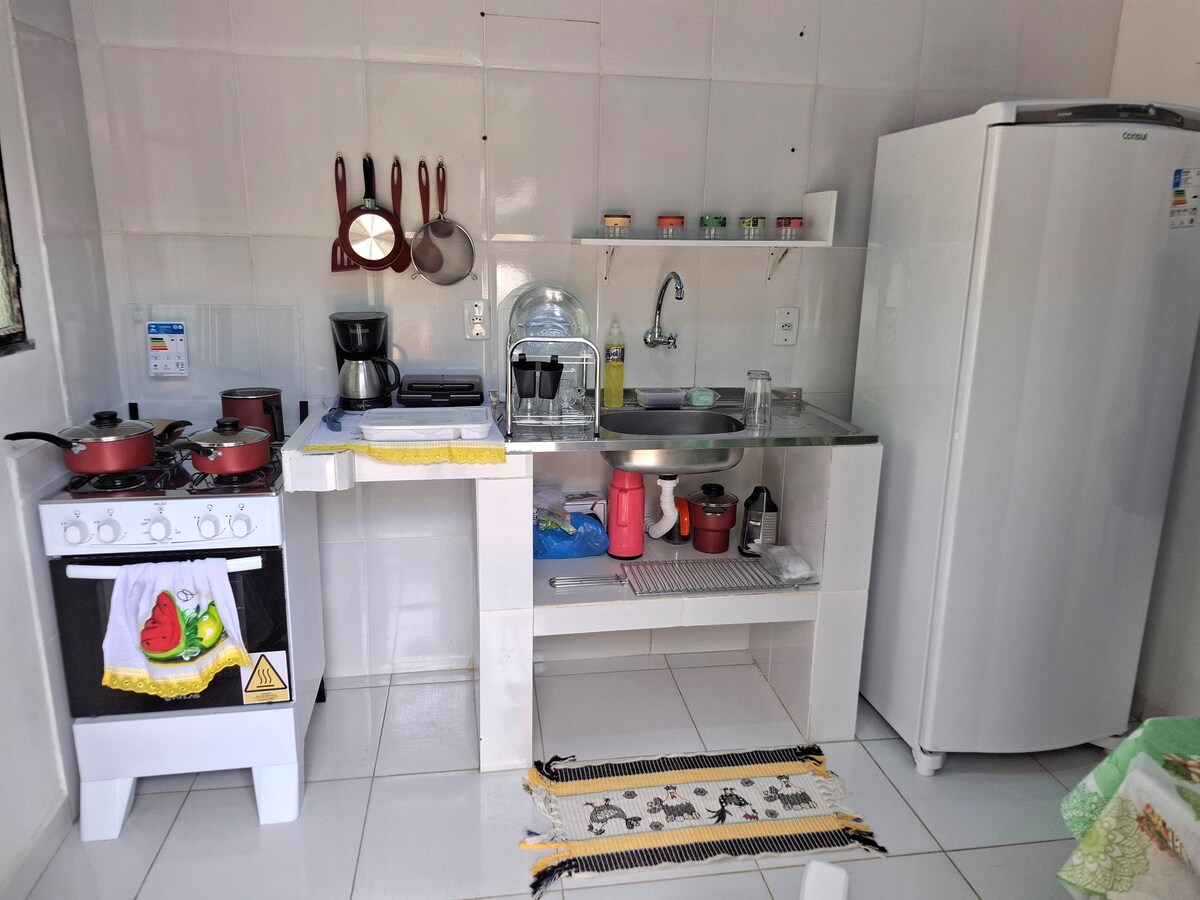 Kitnet cómodo y reservado. Está separada de la casa principal, lo que permite entrar y salir libremente. Tiene un dormitorio con cama doble, un baño y una cocina/sala de estar. Microondas, cocina sin horno, minibar y cafetera. Proporcionamos sábanas, almohadas, toallas y papel higiénico. No hay ducha eléctrica en este momento y no se permiten perros ni gatos