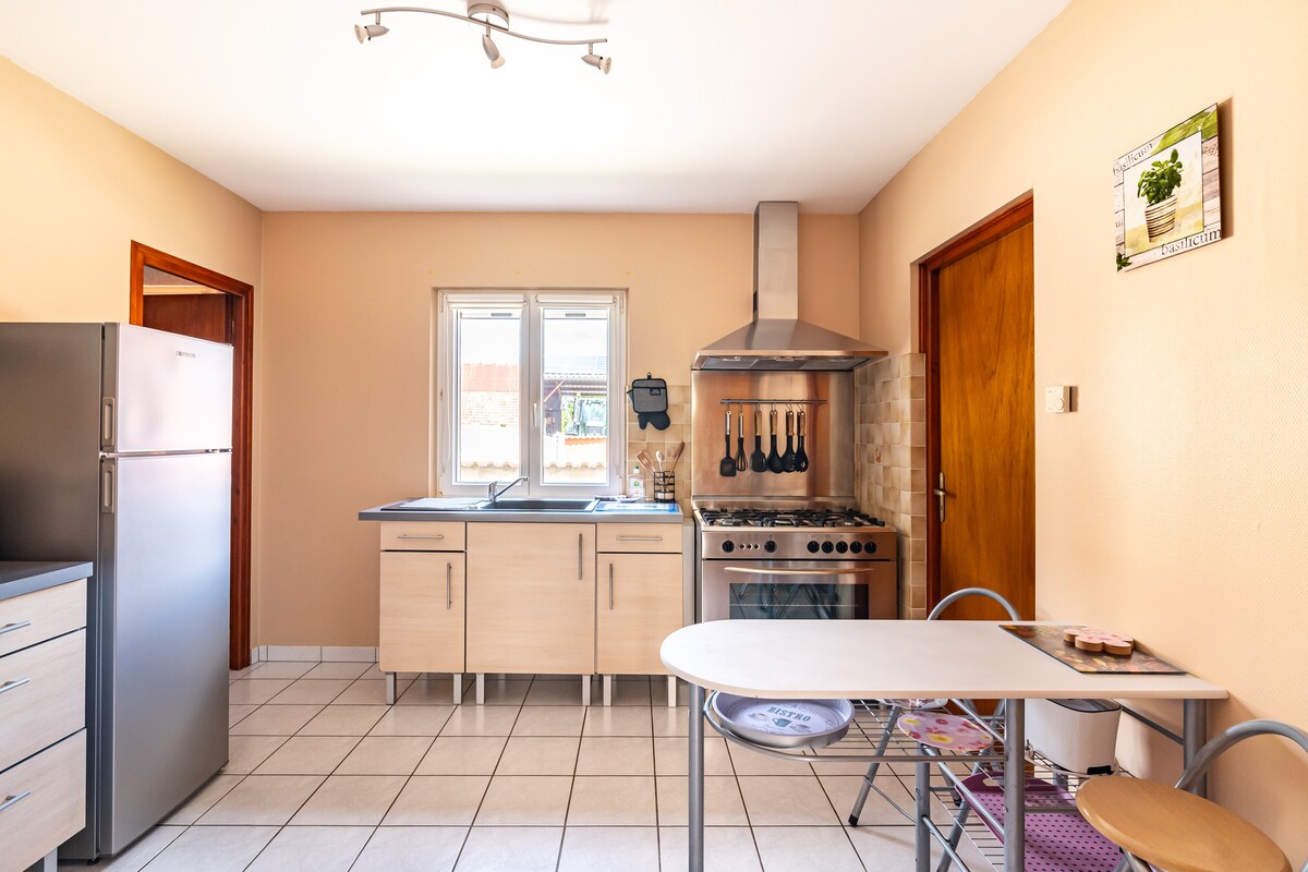 Casa rural con encanto*** climatizada, renovada en estilo alsaciano con carpintería en el segundo piso de una casa alsaciana. Apartamento con cocina equipada, baño con ducha e inodoro, salón, s-a-m, 1 dormitorio con 1 cama doble de 1,40 m y 1 dormitorio con 2 camas de 1 m y 1 cama de 90 cm. Ropa de cama y toallas disponibles Cama plegable, trona. Tumbona Casa rural en el límite de los 2 departamentos, a 7 km de Alemania. Parque de atracciones EUROPA PARK a 20 min. Alemán + (inglés) Climatizado y abuhardillado. 🅿️ en el patio.