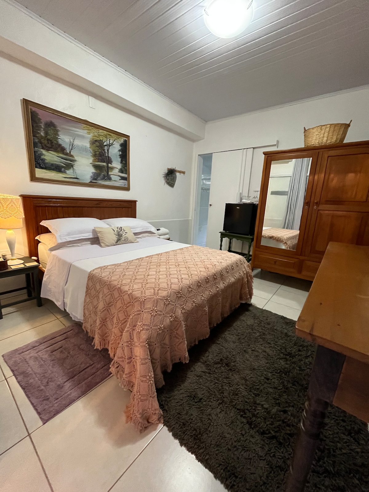 CANTINHO ÍTALO-GERMÂNICO HOSPEDAGEM. A Suíte Lavanda com Café da Manhã é aconchegante, ampla e privativa. Fica na parte anexa da Casa Laranja principal, no térreo,com portão de entrada exclusivo ao hóspede e Acessibilidade. Com ar condicionado,Banheiro amplo,cama de casal padrão confortável,Frigobar e Hall de chegada com mesa para trabalhar/estudar e desfrutar do Café da Manhã entregue e incluso na hospedagem. Localizada a 6,2Km (05-08 minutos) das Festas/Festivais na Cidade de Domingos Martins.