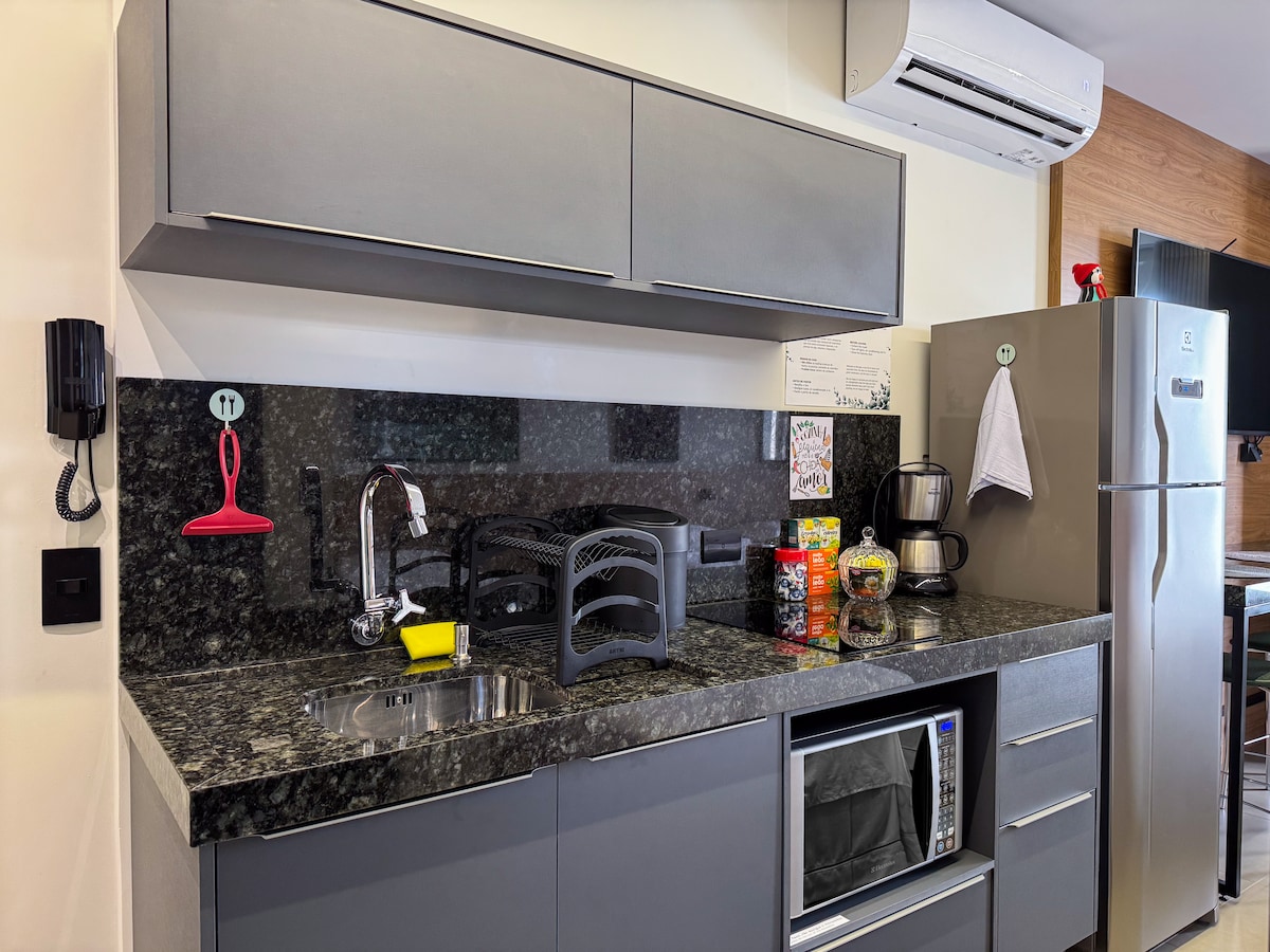 Apartamento en el centro, de alto nivel y completo. - 1 estacionamiento; - 3 dormitorios con aire acondicionado; - Internet; - Smart TV con Netflix. La cocina está completa con todos los utensilios en perfecto estado; - Ropa de cama y ropa de baño. - Cuna (consulta disponibilidad) Check-in y check-out flexibles con portero las 24 horas. Excelente ubicación: cerca de Willie Davids, del Mercadão Municipal y del supermercado de al lado. En la décima planta, con 3 ascensores. Ventanas y balcones con malla de protección infantil Aceptamos mascotas con guía 🐶