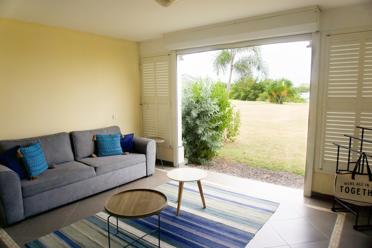 me encanta este estudio, es mi favorito. Estudio luminoso, espacioso con vistas al mar en una residencia tranquila. Cerca de todas las tiendas, restaurantes, playa y centro de la ciudad de Marigot. Ideal para una estancia relajante y zen. Este estudio cuenta con una cocina totalmente equipada, horno tradicional de calor giratorio, microondas, 3 placas de inducción, nevera congelador y un amplio espacio para cocinar. Este estudio también tiene un baño equipado con una lavadora. Piscina semiolímpica incluida.