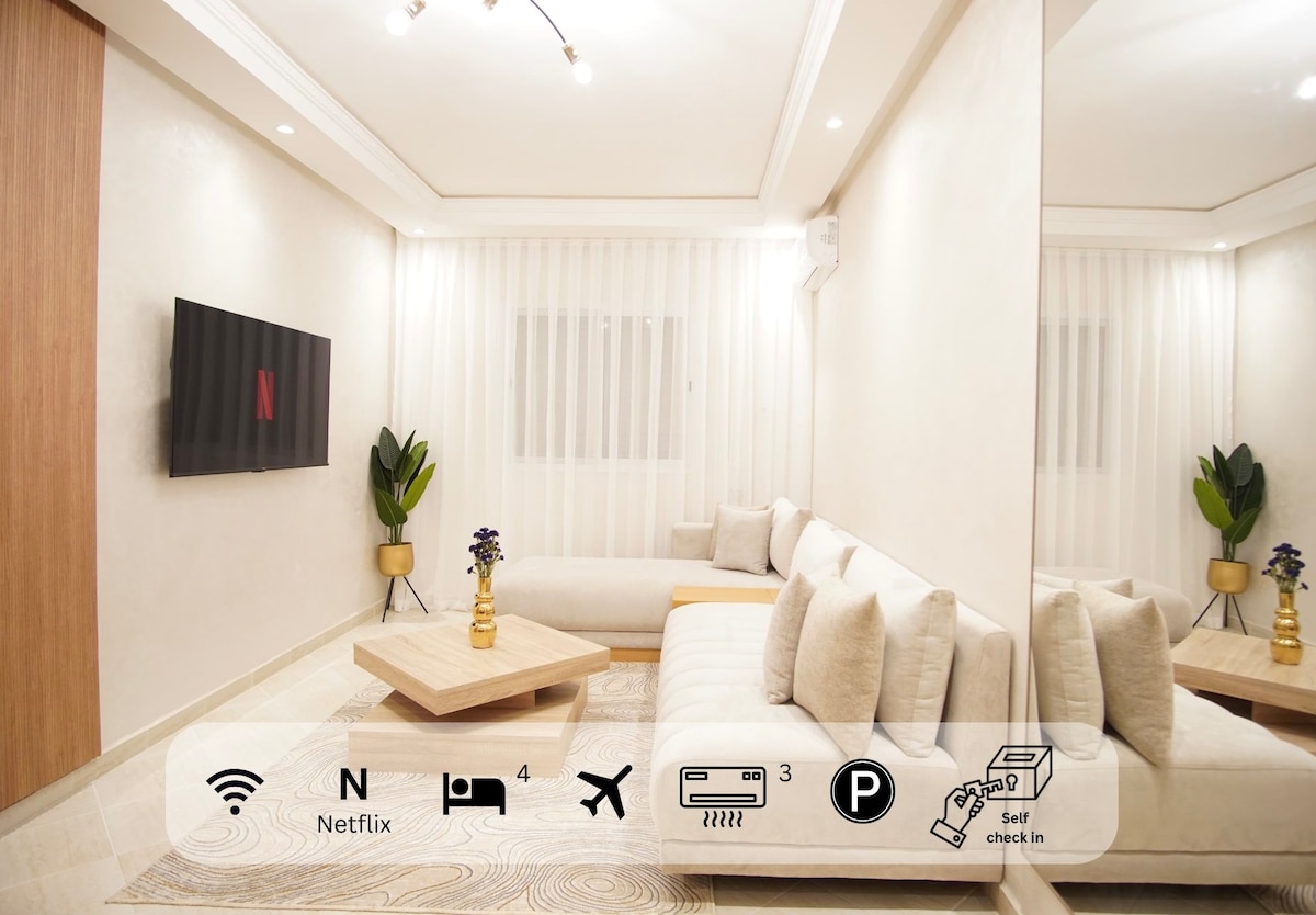Acogedor y moderno apartamento, cerca de todos los servicios, seguro, velocidad de internet de 100 megas, aeropuerto de Marrakech a 20 minutos a pie, estación de tren, jardines al lado, medina.medio de transporte al lado Estaré a su disposición durante toda su estancia y para hacer su estancia inolvidable, , para las personas Marie o familia , individual,las parejas extranjeras no necesariamente le ofrecemos especialidades marroquíes he hecho traslados al aeropuerto por la mañana temprano organizado