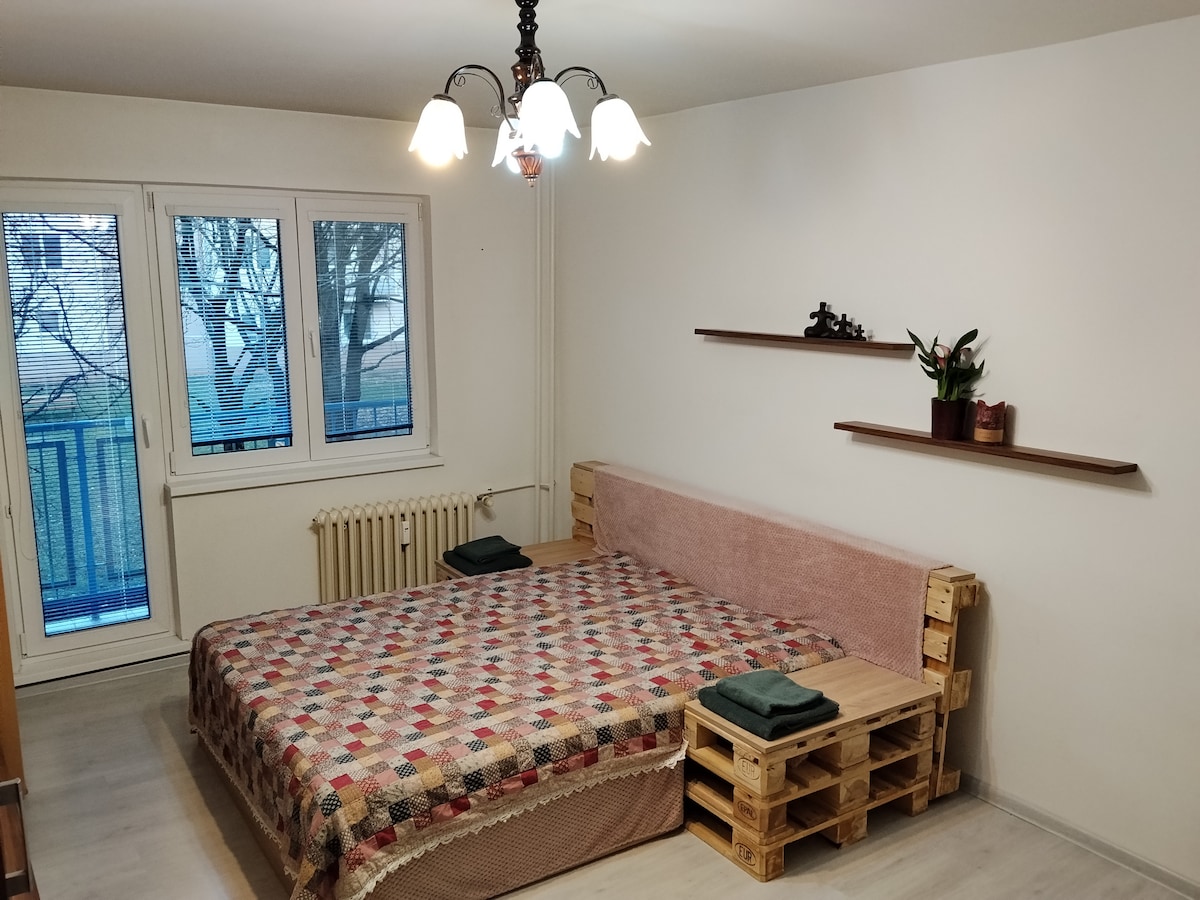Ofrezco un apartamento súper equipado para alquiler de corta duración. Cuenta con una amplia sala de estar con sofá cama y un dormitorio con cama de matrimonio. El apartamento tiene un baño equipado con bañera y cocina, por lo que también es adecuado para estancias más largas. El apartamento tiene vistas al parque (barras de otoño, parque infantil). Se encuentra cerca del centro de la ciudad y a poca distancia a pie de muchos tipos de tiendas. Parada de transporte público (2 minutos) que te llevará directamente al centro de la ciudad (5 minutos).