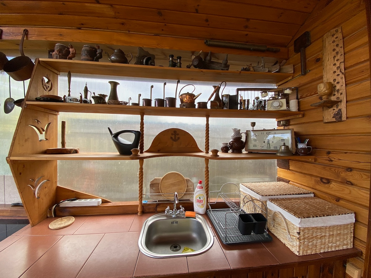 La casa de huéspedes para familias se encuentra en Jurmala, a 300 metros del mar Báltico. Hasta 6 personas pueden vivir cómodamente en las 2 habitaciones. La casa está construida de madera pura, de estilo único, artesanal y rústico. En la propiedad privada tendrás tu propio patio vallado con barbacoa/parrilla, aparcamiento, cama elástica para niños, piscina para niños en verano. Alquiler de coches y bicicletas baratos y piscina infantil en verano.