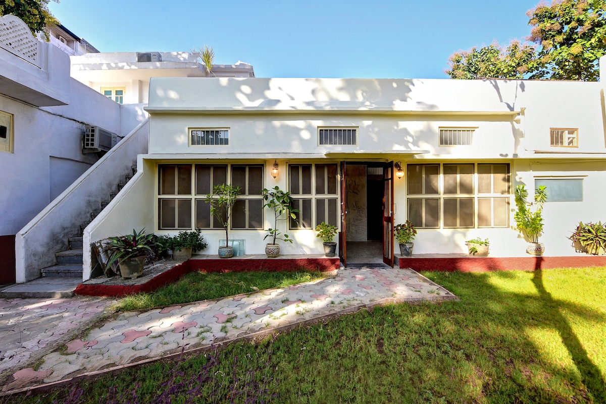9 Para Villa, is part of an 86-year-old heritage homestay - The Para Villas, offers a tranquil retreat in the city's heart, surrounded by lush trees. Named by its owner, Colonel Bhishm Kumar Shaktawat, a retired para commando and war veteran, this homestay blends history, nature, and comfort. The two-bedroom villas feature cozy living area, kitchen, and verandah opening into greenery and an organic garden. This is a tranquil escape with thoughtful amenities and a stunning natural backdrop.