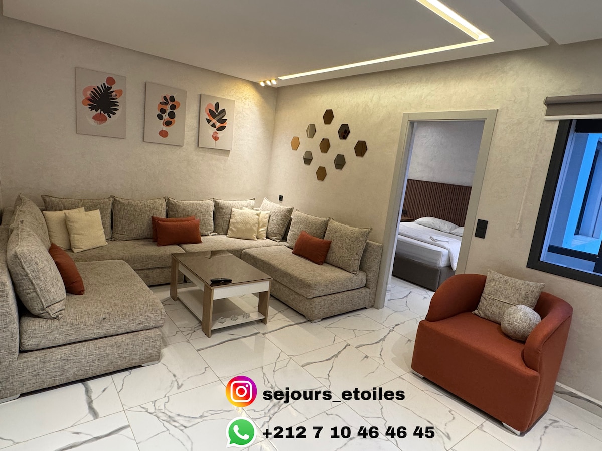 Bonito apartamento nuevo en una residencia privada segura con 3 piscinas, un parque infantil, aparcamiento gratuito en el lugar y a 5 minutos de la playa. El apartamento consta de 1 dormitorio con baño, un salón, un comedor, una cocina bien equipada, un baño y una gran terraza bien equipada. Cerca de todos los servicios (cafetería, restaurante, farmacia y supermercado), el apartamento está a 10 minutos de Martil y M'diq.