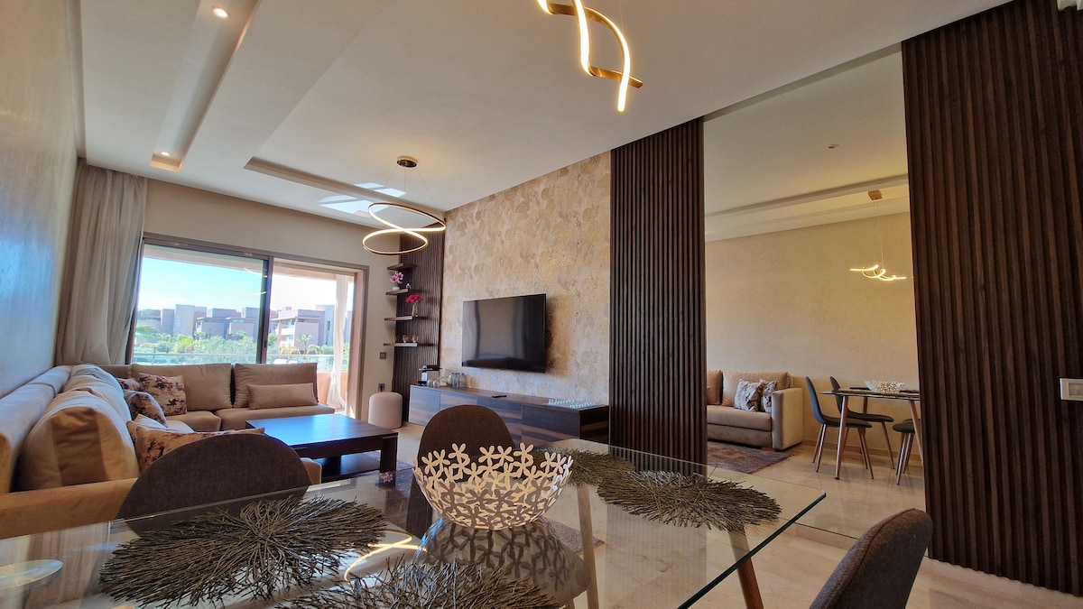 Situado en la avenida Mohammed VI de Marrakech, este moderno apartamento ofrece 3 dormitorios, 2 baños, una piscina climatizada y un gimnasio privado. Dos azoteas privadas con vistas panorámicas al campo de golf y a las montañas del Atlas, perfectas para familias o amigos. La residencia segura ofrece seguridad las 24 horas, los 7 días de la semana, para una estancia tranquila. Nota: El apartamento está cerca del aeropuerto, por lo que puede haber ruido ocasional de aviones. Compartimos esta información abiertamente para garantizar una experiencia transparente y cómoda durante tu visita.
