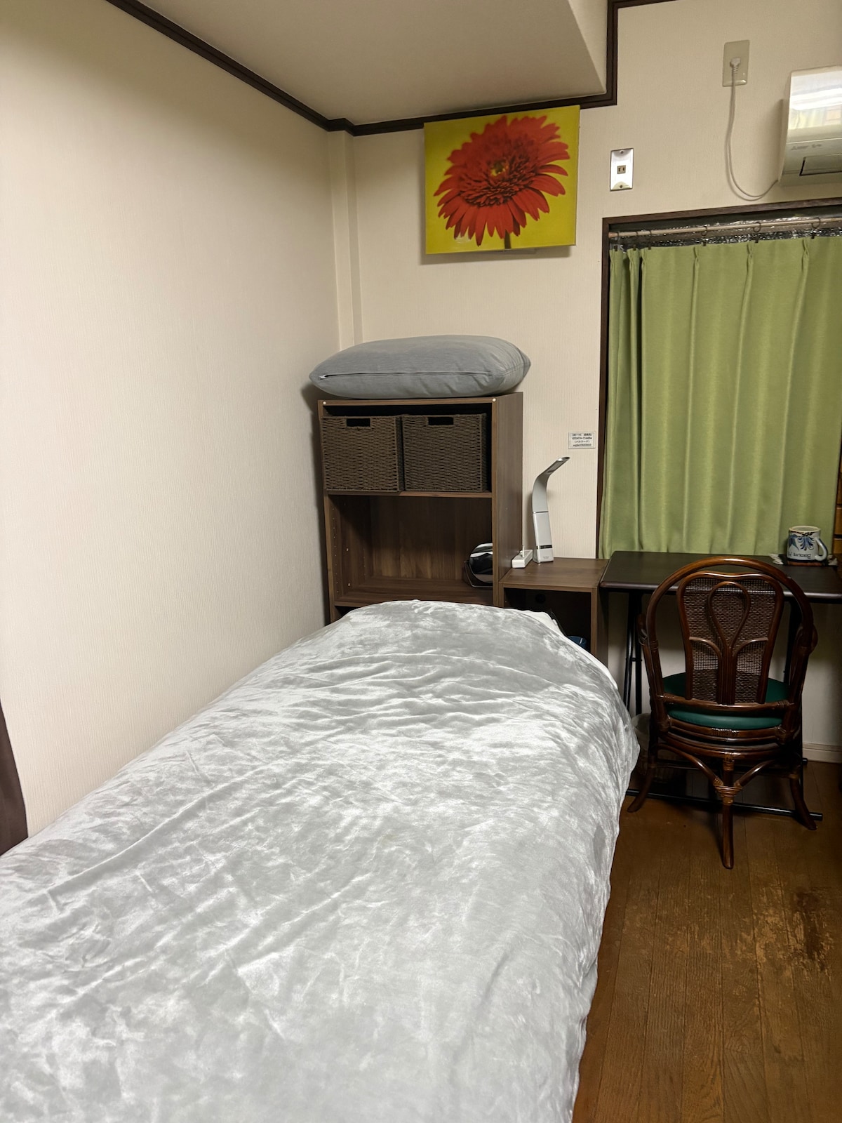 Habitación individual con cama en casa de huéspedes para personas que deseen pasar una estancia tranquila. Es una casa de estilo tradicional japonés registrada como activo cultural tangible.