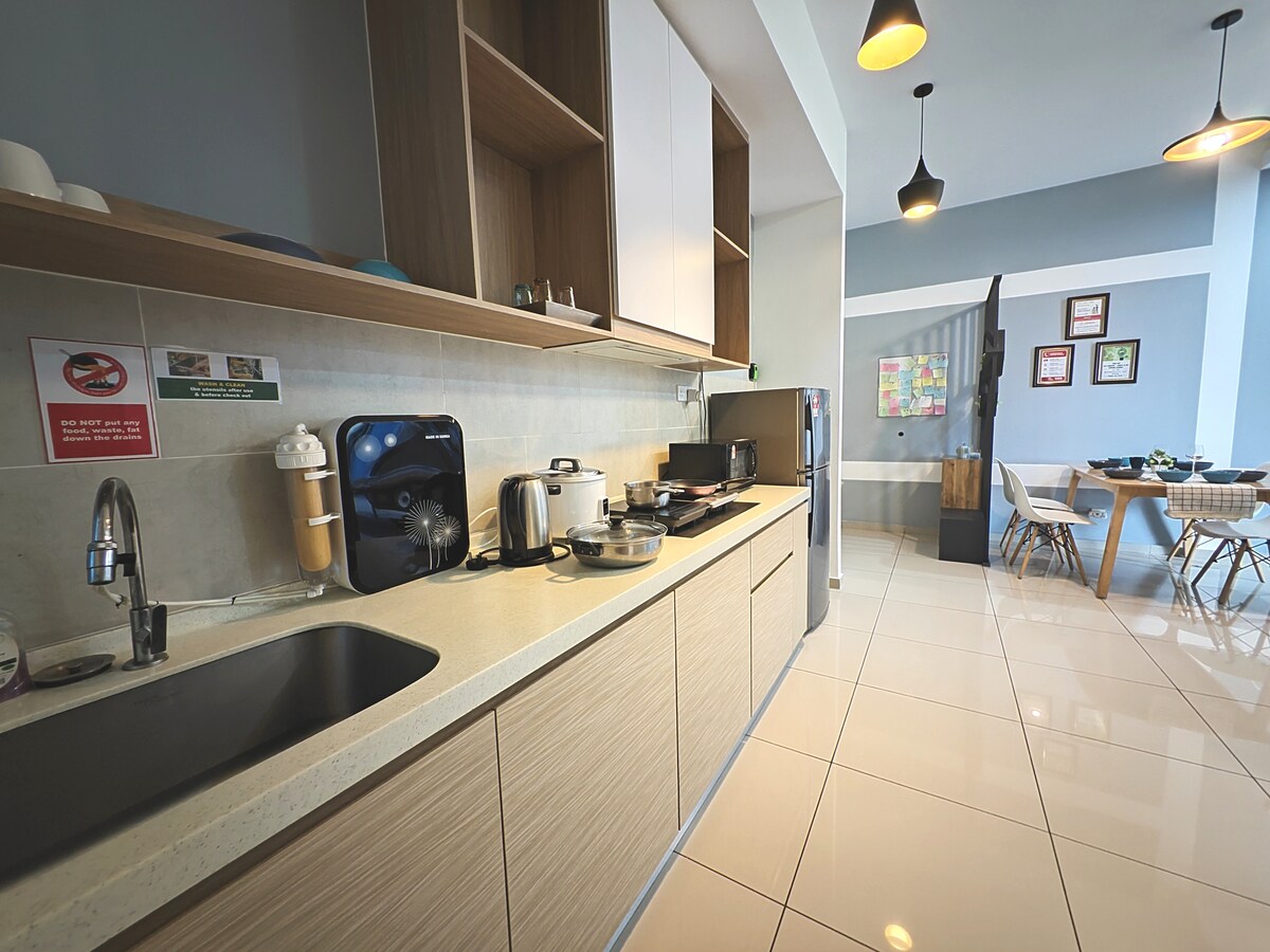 ¿Cuántas personas pueden alojarse aquí? El apartamento tiene capacidad para 4 personas y es cómodo para 6 personas. Está ubicado en el corazón de la ciudad de Melaka y a solo 3 km del edificio histórico A'Famosa y del edificio Studthuy's. Instalaciones: Ofrecemos aparcamiento GRATUITO para 1 coche en el nivel 2. Otros pueden aparcar en la planta baja. Lista de servicios que se proporcionan dentro de la casa: Este elegante apartamento también cuenta con 2 camas tamaño queen y 1 sofá cama plegable tamaño queen, 1 toto adicional, TV LED de 60 pulgadas con Android, wifi, etc.