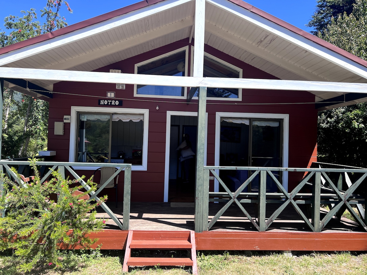 Cabaña Notro, muy acogedora, completamente equipada, 1 habitación con cama matrimonial, 1 habitación con 1 litera y 1 cama de plaza y media, living comedor completo, cocina americana full equipada y 1 baño común, Estufa de combustion lenta. Televisión led 40”, cable Direct Tv, acceso a internet por Wifi. Terraza techada, con asientos y parrilla para asados.-