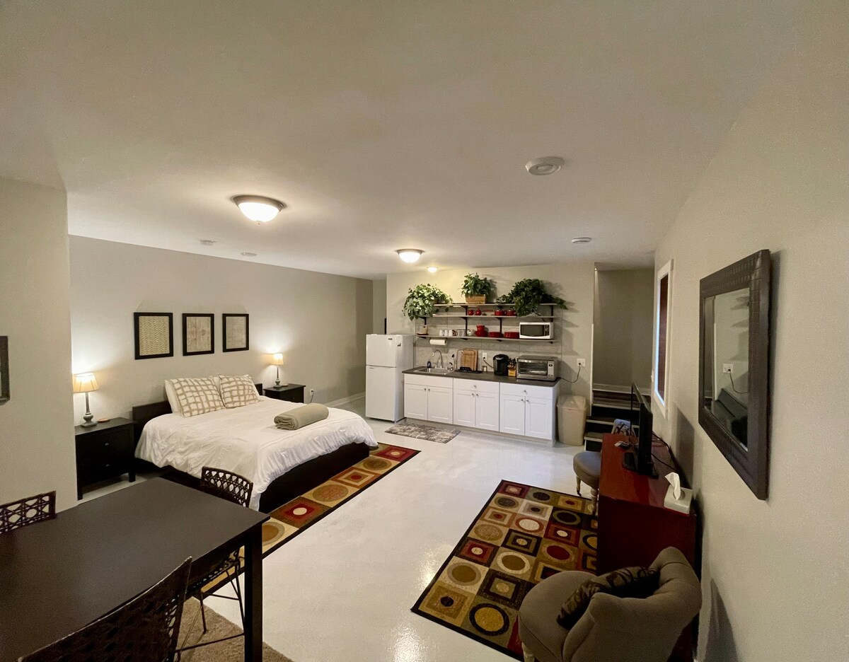 Entra por una entrada privada a este apartamento tipo estudio en el sótano. Construido recientemente en 2018, el espacio está bien iluminado, aislado y en un barrio tranquilo. Disfruta de un baño completo con lavandería y una pequeña cocina: nevera de 4,5 pies cúbicos, microondas, horno tostador extra grande, placa calefactora, olla de barro, ollas, sartenes, platos, cafetera keurig y fregadero de cocina completo. 1 cama tamaño queen con capacidad para dos personas. Los huéspedes deben tener al menos 3 evaluaciones positivas de estancias para reservar nuestro espacio.