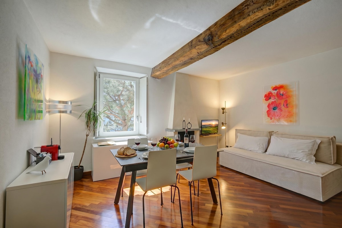 El apartamento está en el centro histórico de Mendrisio, a 50 metros hay un ascensor a la Piazza alla Valle, donde está el centro comercial. La estación está a 5, máximo 10 minutos a pie. Los trenes frecuentes te llevan a Lugano o Como en 25 minutos, 90 a Milán. Versión en inglés: El apartamento está situado en el centro histórico de Mendrisio, a 50m está el ascensor a Piazza alla Valle, donde está el centro comercial. La estación está a 5, máximo 10 minutos a pie. Los trenes frecuentes llevan a Lugano o Como en 25 minutos, 90 a Milán.