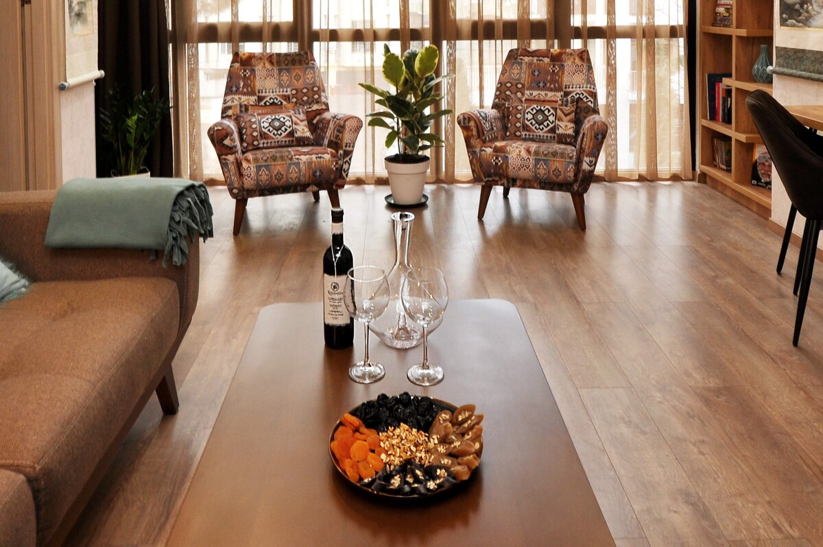 Una cueva moderna en Vake, cuidada, tranquila y muy bien cuidada. «Dos bisontes» cargan a través de la pared como ecos de piedra antigua. Las plantas prosperan en rincones tranquilos. Dos balcones abiertos a la brisa; en el interior, formas escultóricas, texturas suaves y una sensación de historia. Cada detalle está colocado con amor, cada comodidad se proporciona cuidadosamente. Es inspiradora, un poco salvaje y perfectamente arraigada. Disfruta de la buena comida, los parques verdes y el suave zumbido de la ciudad. Entonces vuelve. Esta es tu casa.