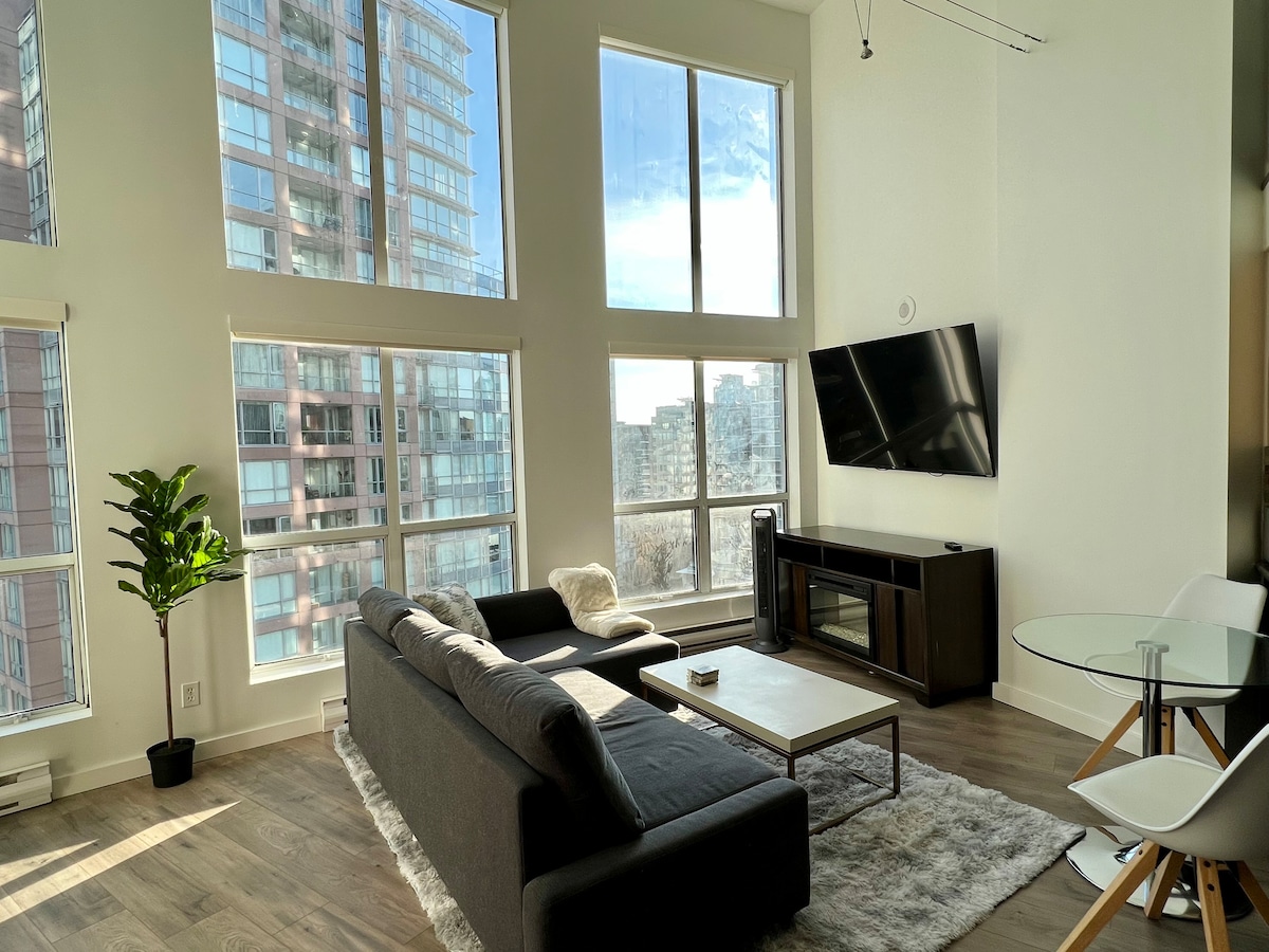 Disfruta del centro de Vancouver desde arriba en este exclusivo ático de gran altura con espectaculares techos de doble altura y cristales de suelo a techo. Despiértate con vistas panorámicas desde la cama, sal a tu balcón privado para tomar el café de la mañana y relájate al atardecer con las luces de la ciudad a tus pies. Recientemente renovado con muebles nuevos, ropa de cama mejorada y acabados modernos en todo el espacio, ofrece un ambiente limpio y elevado que se siente lujoso y cómodo.