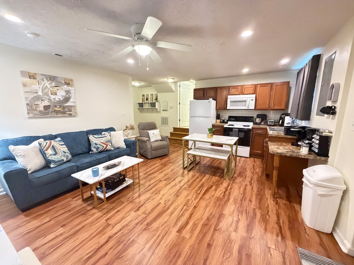 Escápate a la suite Mountain Momma, donde el diseño moderno se une al encanto de los Apalaches. Esta acogedora suite de 2 dormitorios y 1 baño ofrece una comodidad elegante y un toque de orgullo de Virginia Occidental. Disfruta del equilibrio perfecto entre privacidad y fácil acceso a restaurantes, tiendas y aventuras al aire libre. Tanto si te relajas en el interior como si exploras la belleza del estado de la montaña, la suite Mountain Momma es tu acogedor hogar lejos de casa en el Wild & Wonderful Retreat.