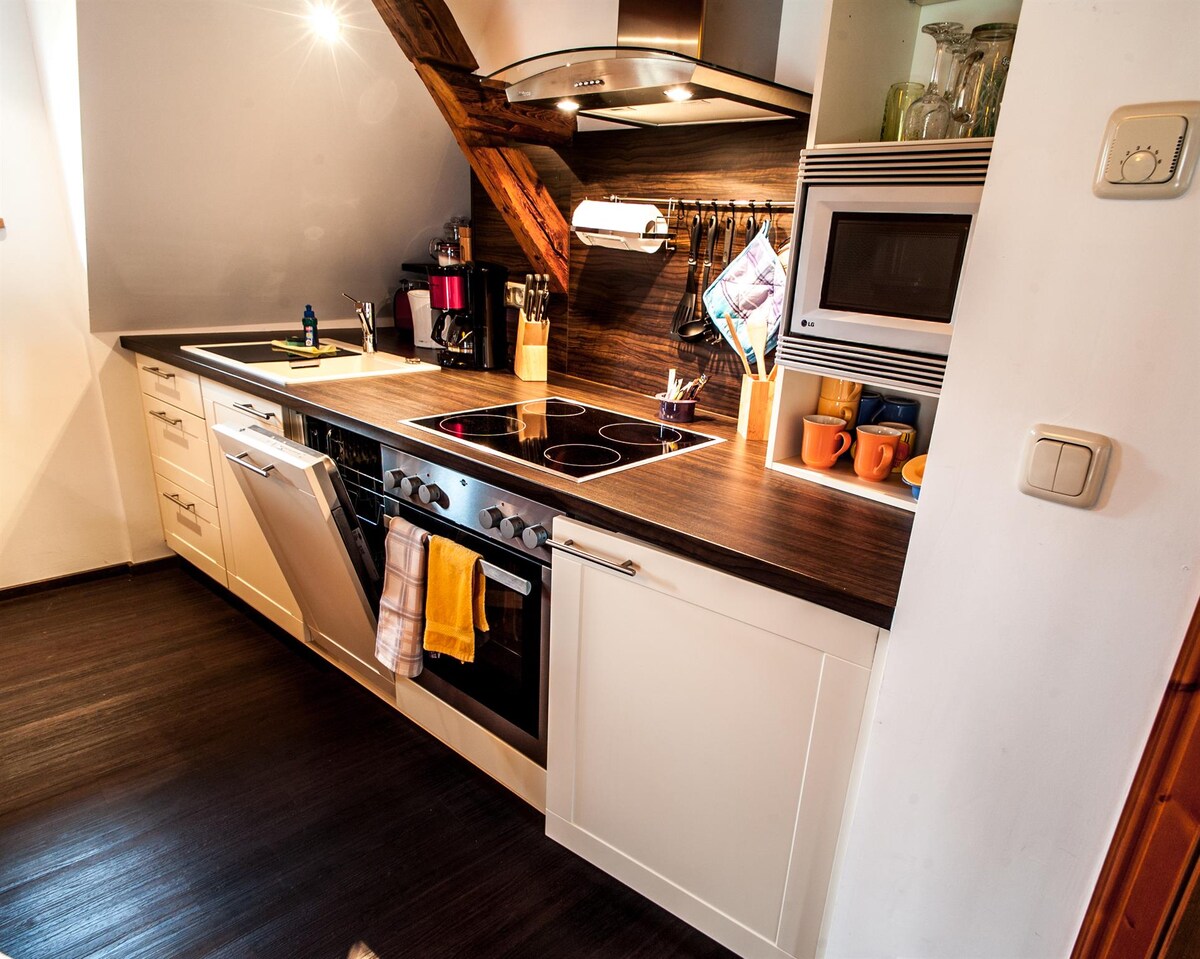 Te alojarás en un moderno apartamento en el ático de 75 m². El apartamento ofrece dos dormitorios con camas de matrimonio (1,80 x 2,00 m), una sala de estar con sofá, sillón, cocina y comedor, un baño con ducha, un pasillo y un pequeño balcón. También hay una caja fuerte y una plaza de aparcamiento. Por la noche, el bar de la casa te invita a servirte lo que quieras, y en el patio puedes hacer una barbacoa o relajarte junto a la hoguera. La tienda de fiestas está disponible para grupos más grandes (solo para huéspedes de la casa).