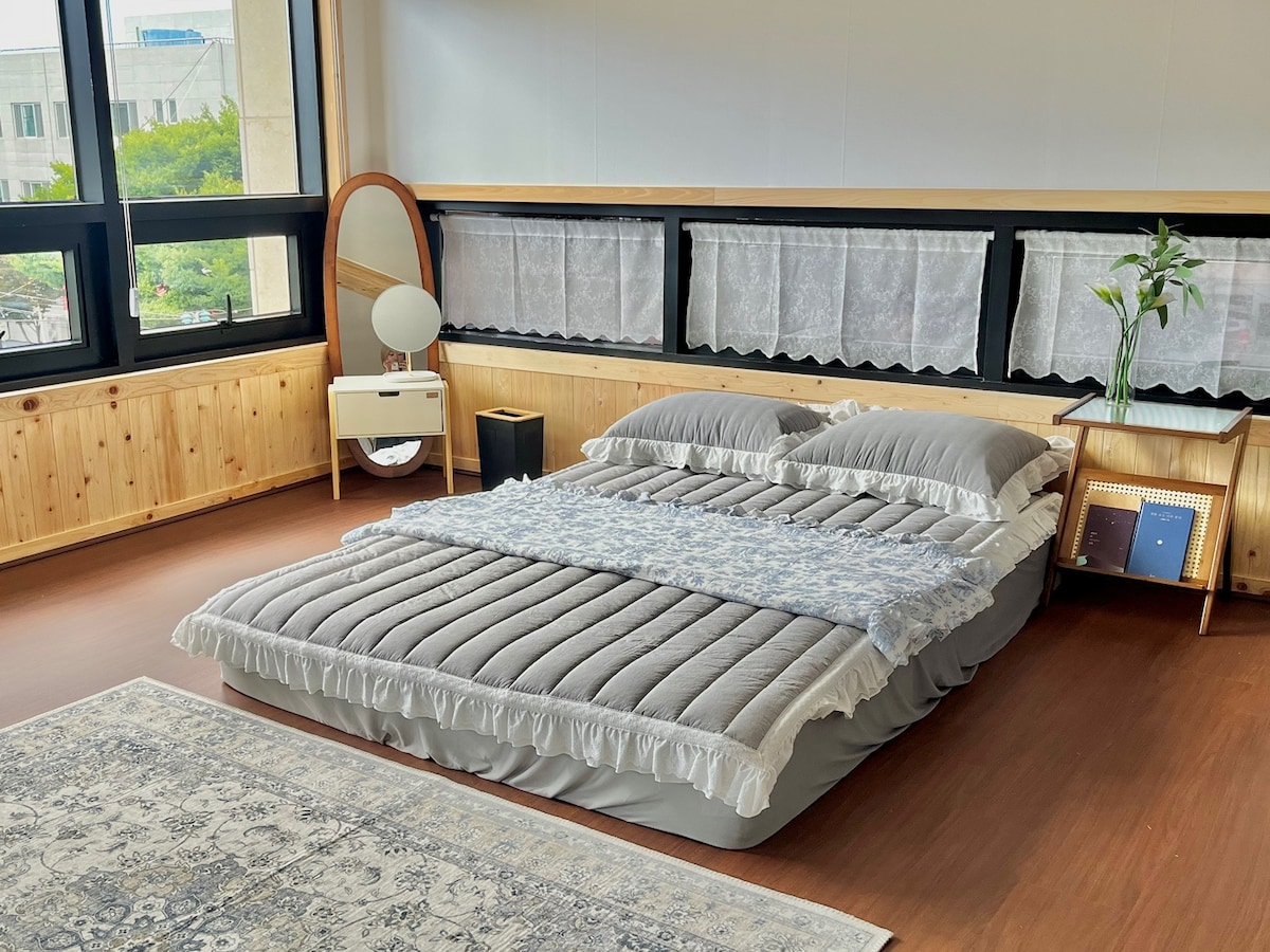 Es un amplio alojamiento adecuado para toda🤍 la familia. (50 pyeong) _4 camas < King 1, Queen 3, > _2 baños (1 dormitorio principal, 1 delante del salón) _Aparcamiento disponible Ascensor X (4.º piso) levantaré cargas pesadas _Aire acondicionado y electricidad en cada habitación _Estación de Mokpo: 4 minutos a pie _4 .ª planta del edificio Hwang Park Sa Chungdigi frente a Korombangjae _Yudalsan Dulle-gil 10 minutos a pie _Museo de Historia Moderna de Mokpo a 9 minutos a pie _Terminal de ferris de Mokpo-yeonan a 5 minutos en coche _Estadio Mokpo a 15 minutos en auto _Desinfección Cesco _Te de bienvenida proporcionado (te doy un vaso de Ame en Cafe Soo en el segundo piso🖤) _Champú, acondicionador, gel corporal, pasta de dientes, esponja de ducha, papel higiénico, toalla, etc. (Cepillo de dientes x) _Microondas, puertos de café, quemador de gas, purificador de agua, freidora de aire _Smart TV Netflix, YouTube, etc. _Acceso exclusivo a la azotea _Altavoz con bluetooth _Cocina disponible (cocina, azotea) equipo de barbacoa x, parrilla eléctrica O, plancha _Instalar un calentador en el salón _Llegada a las 3:00 p. m./salida a las 11:00 h. _Si hay más de 6 personas, se añadirán 20 000 won. _Puedes guardar tu equipaje con antelación _La anfitriona está muy atenta a la limpieza.