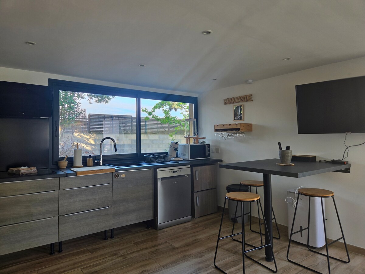 Disfrute de la elegancia de este alojamiento agradable y tranquilo a 15 minutos del mar. A 20 minutos de Sète y a 10 minutos de la autopista A9. Acceso a la piscina, estudio independiente y planta baja de una casa en el corazón del pueblo. Situada en una calle tranquila, la casa ofrece alojamiento para dos personas, accesible a pie. Fácil de aparcar en el pueblo , de forma gratuita. Posibilidad de venir con un bebé o niño pequeño. Se proporciona una cuna y una silla de bebé. Cocina equipada, TV wifi