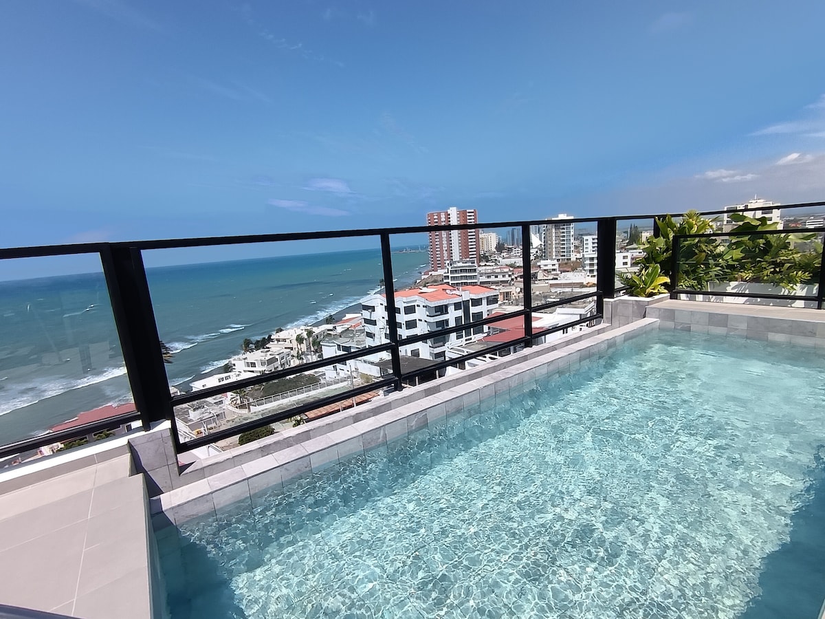 Departamento en el centro de la ciudad de Manta con vista al mar. Ubicado en la primera línea al mar con acceso directo a la playa El Murciélago, a pocos metros a pie del malecón escénico, restaurantes, Mall del Pacífico y supermercados; cuenta con generador de energía, piscina climatizada, jacuzzi, gimnasio, estacionamiento, ascensor y zona de recreación para niños, el edificio es totalmente seguro y sus instalaciones son las adecuadas para pasar unas vacaciones en familia, pareja o amigos.