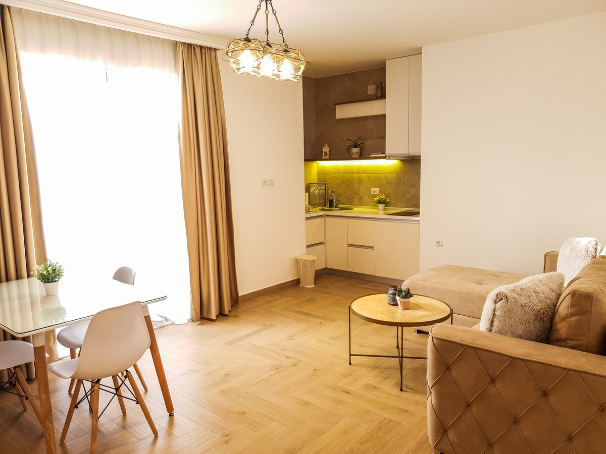 Hermoso, moderno y cómodo apartamento, categoría de lujo construido en 2022. Se encuentra a 30 m de una hermosa playa de arena. 5º piso de un edificio de apartamentos con ascensor. Lugar tranquilo y silencioso, donde todo está cerca. Cama de matrimonio de calidad premium, 180 cm de ancho. Cómoda, con colchón ortopédico. Ropa de cama limpia y recién lavada. Baño moderno y de diseño con ducha. Terraza con muebles de jardín y vistas a las montañas.
