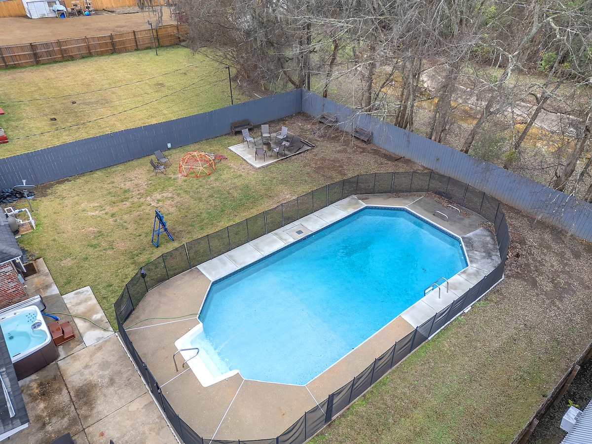 Tu familia estará cómoda en este alojamiento espacioso y único. Bienvenido a tu oasis privado cerrado rodeado de bosques y exuberante vegetación en el corazón del sur. Esta hermosa casa ofrece una mezcla perfecta de encanto clásico sureño y comodidad moderna, proporcionando una escapada serena para ti y tus seres queridos y amigos. La casa está preparada para la relajación y la diversión; mesa de billar, televisores, piscina privada cristalina, bañera de hidromasaje, parrilla y 2 porches (al aire libre y protegidos) para crear recuerdos duraderos.