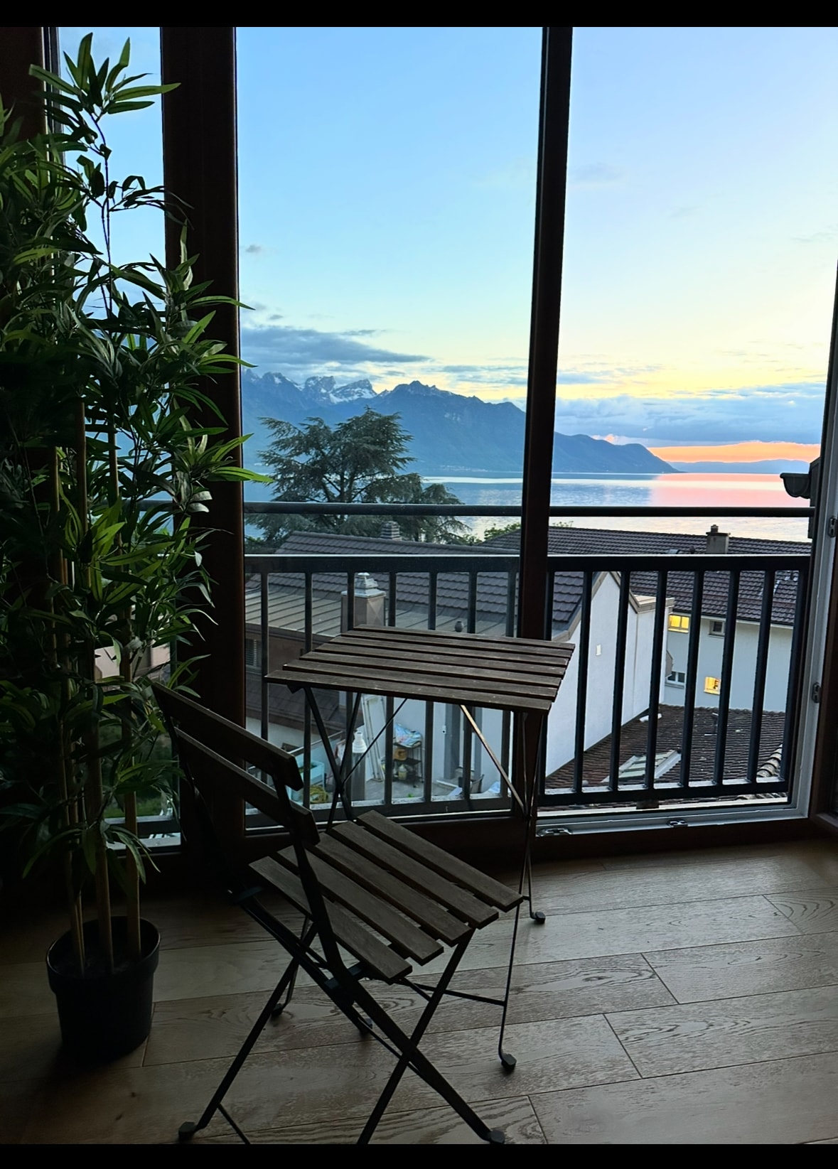 Te ofrecemos un elegante apartamento estudio con balcón en el que podrás disfrutar de una espléndida vista del lago de Ginebra rodeado de montañas. Estarás encantado con los amaneceres y atardeceres que se pueden disfrutar desde este piso. Zona muy tranquila y segura. Perfecto para parejas incluso con niños.