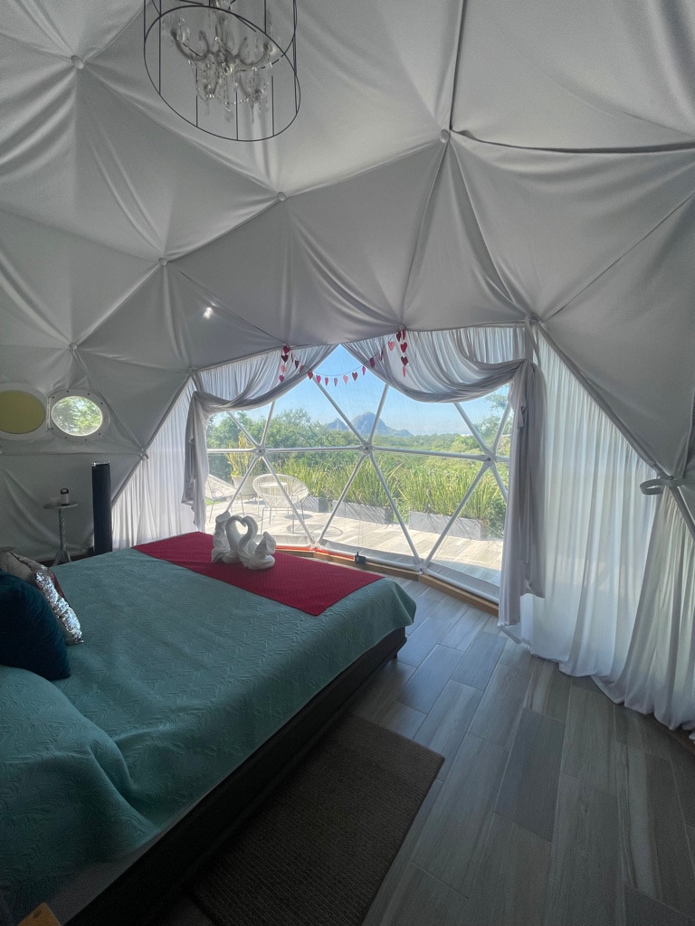 Escápate con tu pareja a una experiencia original en nuestro Domo geodésico, ubicado en Quinta Amatzinac con una vista espectacular al cerro de Chalcatzingo. Un espacio íntimo que combina el contacto con la naturaleza con todo el confort: cama King Size, baño privado, aire acondicionado, WiFi, cafetera y mini refrigerador. Disfruten de su terraza y patio privado, con hamacas y una pérgola con camastro doble para momentos de descanso y complicidad. Ideal para reconectar y dejarse sorprender.