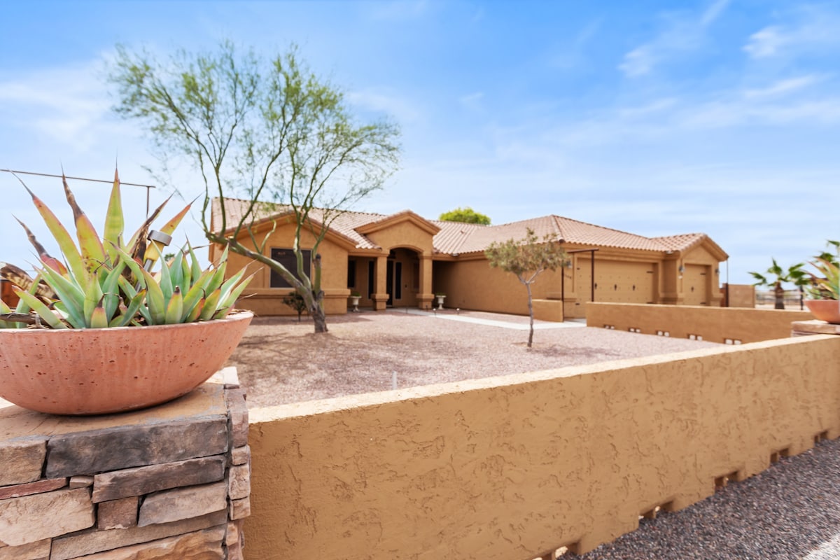 ¡Naturaleza en el mejor de los casos! Ubicado en poco menos de 2 acres en una colina donde se pueden ver las hermosas vistas panorámicas de Vulture Mine Peak y las luces de nuestra pintoresca y pequeña ciudad. Una adorable casa hacienda de 2 dormitorios y 2 baños con capacidad para hasta 6 personas. Además, ¡2 corales (17x40) con corales redondos y cuarto de tachuelas! Súper cerca de todo. Ubicado junto a la propiedad de Az Preserve para kilómetros de senderos para montar a caballo, así como bicicletas,motocicletas, etc. Las fotos no hacen justicia. Es una visita obligada!!!