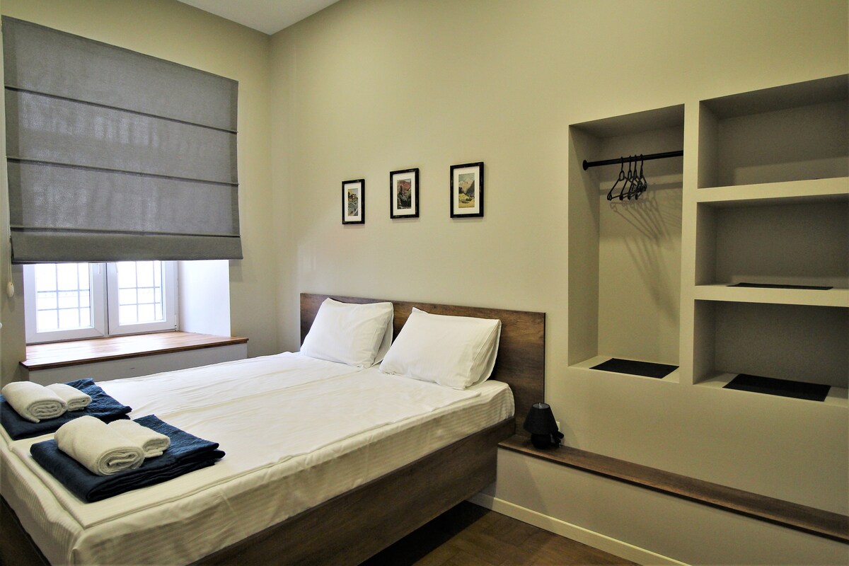 Habitación luminosa con dos camas tamaño queen, ideal para familias pequeñas o grupos de cuatro. Incluye baño privado con ducha a ras de suelo, conexión wifi gratuita, TV, caja fuerte, mininevera y hervidor eléctrico con café y té. Se proporcionan toallas, sábanas y artículos de tocador. Cocina americana compartida y espacio de coworking disponible. Esta habitación da a la parte trasera del edificio. Ubicado en el centro de Vake. Llegada/salida sin contacto