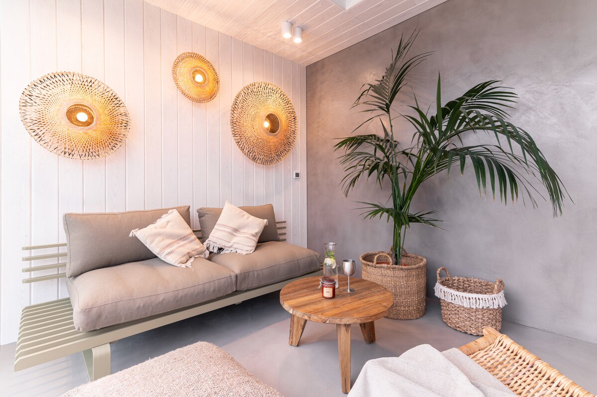 GT es un espacioso apartamento en la planta superior, con 2 terrazas privadas en la azotea, con jacuzzi al aire libre. Hay 2 dormitorios en suite, cocina,comedor/sala de estar con chimenea. El segundo piso cuenta con una sala de estudio/oficina que se abre a dos patios en la azotea, uno para descansar y disfrutar del jacuzzi, mientras que el otro tiene una cocina al aire libre con una parrilla tradicional de leña y un comedor al aire libre.