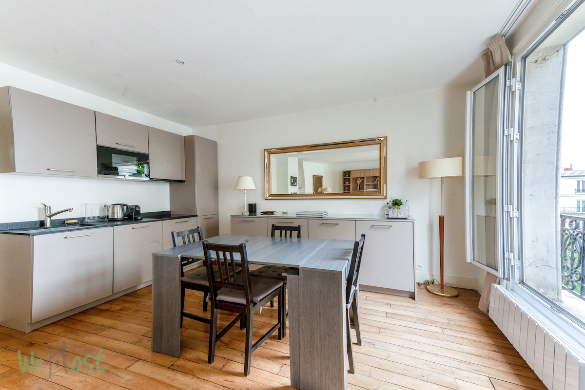 Apartamento dúplex de 54 m² en el corazón de Abbesses, Montmartre. Perfecto par parejas, amigos o viajantes por negocios. En la 1ª planta, zona de día con entrada, aseo independiente, gran salón con sofá cama, comedor y cocina equipada. En la segunda planta, un dormitorio de matrimonio, baño con ducha italiana, balneoterapia, lavabo doble e inodoro. El apartamento está equipado con lavadora, cafetera Nespresso, conexión wifi de alta velocidad y muchos otros servicios para tu comodidad.