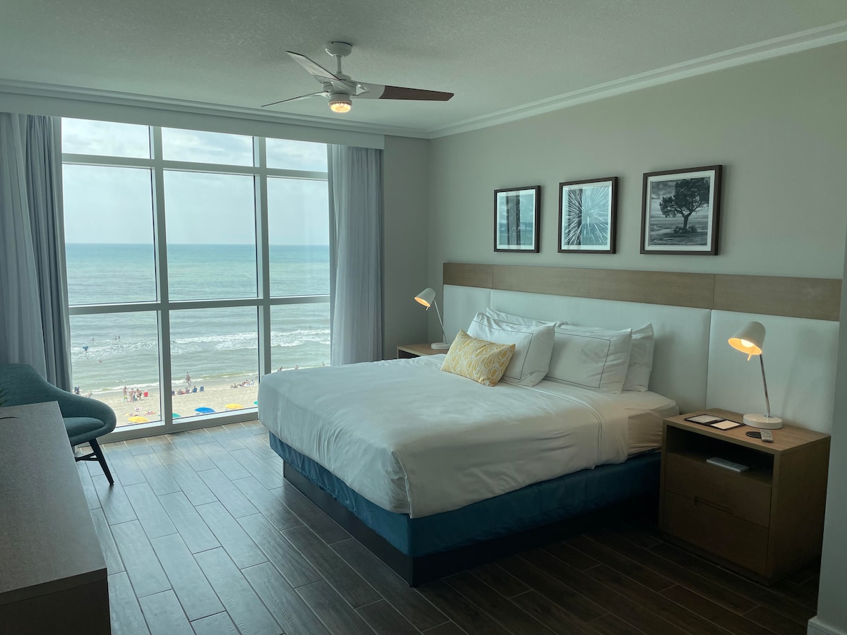 Sofá nuevo Nueva lavadora y secadora Cocina nueva Baño nuevo. Nueva adición con chimenea y consola de pared de TV. Renovado con todo el suelo de madera, muebles y colchones nuevos. Increíble vista al océano Atlántico a través del balcón directo frente al mar, situado en el centro de la playa de Myrtle. A pocos pasos de Family Kingdom Amusement Park, Beach Boardwalk, 2nd Ave Pier. Disfruta de las impresionantes vistas y la brisa en el balcón. Albercas interiores y exteriores climatizadas, 3 jacuzzis, piscina grande para niños, lazy river.