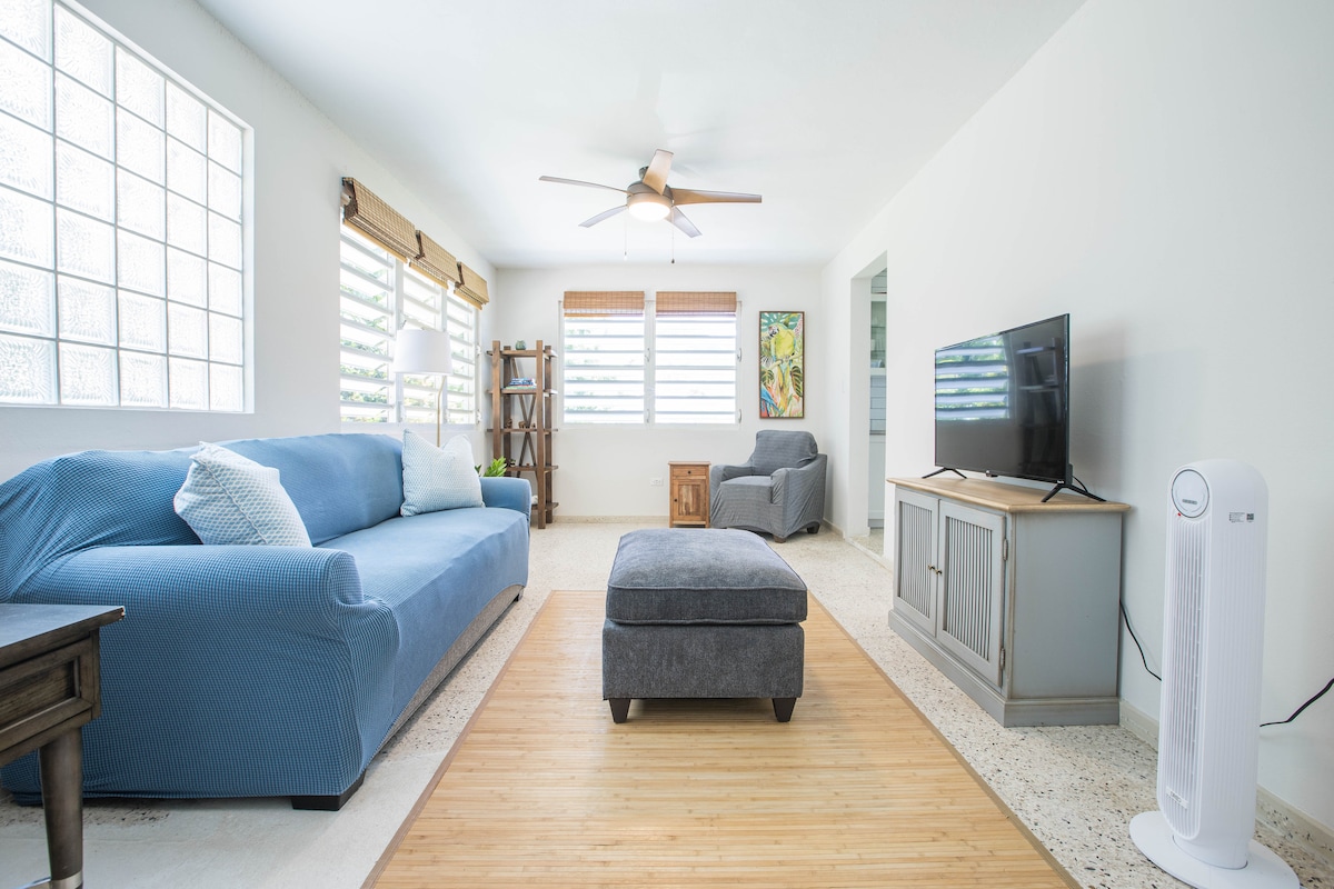 Acogedor estudio en la primera planta, con vistas al paisaje tropical y al mar. A 45 minutos en coche del aeropuerto internacional de San Juan, cerca de la playa de Luquillo y la playa de Fajardo. Otras atracciones incluyen El Yunque, paseos a caballo, esnórquel, ferry a Vieques, Culebra y la isla Icacos. De vuelta en el estudio, puedes disfrutar de una cama tamaño queen para 2 y también de un sofá cama de tamaño completo (caben 2 niños menores de 6 años). Servicio de lavandería para huéspedes que se alojen más de 4 días.