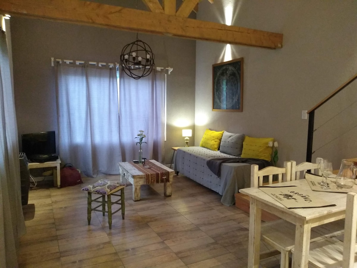 Es construcción nueva en la que utilizamos elementos propios de la zona, un tipico loft, pero al pie de la montaña, un solo ambiente muy humildemente bien decorado, sutilmente íntimo, práctico detalle de la zona de servicios exclusivo, muy reservado, solaz, seguro, con ingreso en auto con portón automático, estacionamiento junto al automovil familiar, hay centros comerciales, a 5’ del centro cívico, buses c/15´Lo fundamental la cordial atención personalizada de Stella & Mario sus dueños.