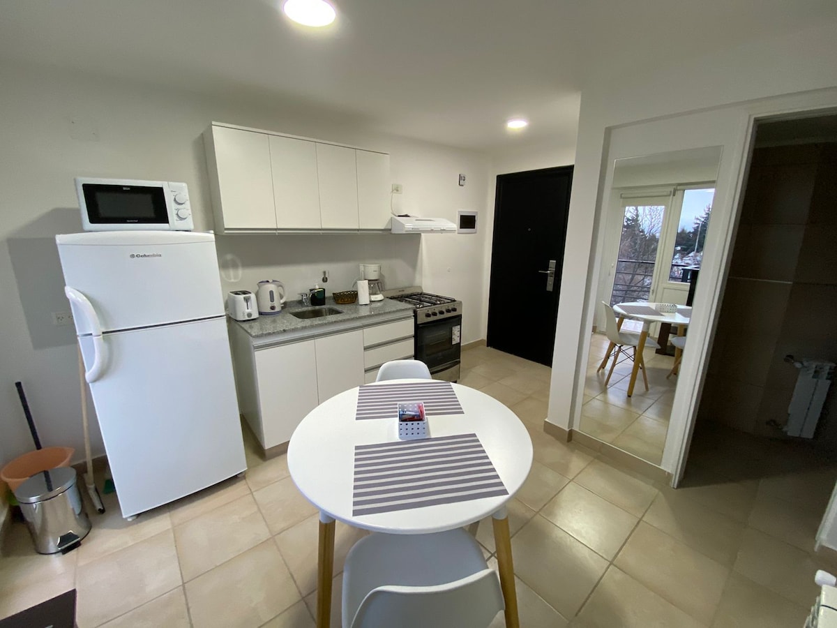 Departamento de 1 habitación para 2 personas en las cercanías del centro de Bariloche. Cuenta con excelente equipamiento de vajillas. TV 40" con Direct TV. WIFI propio del departamento. Baño completo. En las cercanías podrás encontrar quiosco, supermercado, farmacia, panadería, carnicería y fiambrería. Frente al departamento, se encuentra la parada de todas las líneas de colectivos. Balcón. Importante! No se aceptan mascotas ni visitas! Prohibido fumar en todo el ámbito del edificio!
