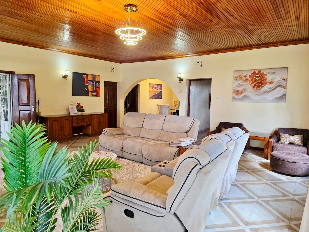 Despiértate con el canto de los pájaros y el aire fresco de Naivasha en esta espaciosa y moderna villa escondida en un barrio tranquilo y seguro cerca del lago. Disfruta de una luminosa sala de estar de diseño abierto con lujosos sofás, televisión inteligente, elegante comedor, wifi rápido, cocina totalmente equipada, amplio aparcamiento y hermosos jardines. Ideal para familias, grupos o parejas que buscan una escapada tranquila pero cómoda a Naivasha.