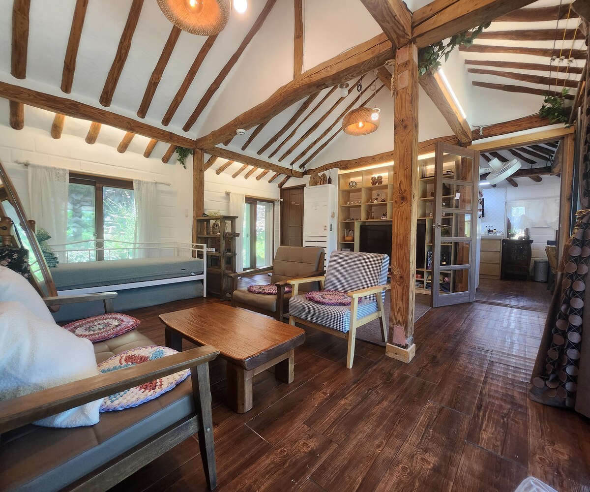 Cuando te acuestas, el techo era precioso. Con ese recuerdo, las vigas siempre me excitan. Me enamoré a primera vista. Decoré la segunda isla; Día. Primera isla; día si fuera rústico La segunda isla; Day es espaciosa, por lo que puedes cultivar un jardín, plantar flores en el jardín y lavarte los pies con agua de pozo... Es una buena casa porque hay muchas cosas con las que soñar. Una celebridad que se instaló en Namhae trajo a un carpintero especializado en Hanok y arregló la casa de una manera moderna utilizando vigas. Este alojamiento es para un solo equipo en un terreno de 141 pyeong. Al abrir la puerta, hay un edificio principal y un anexo. Intenté tener todo lo que necesitaba, como si fuera mi propia casa en lugar de un alojamiento. Una cama Queen en la habitación, Pusimos 2 camas individuales en el salón y preparamos mantas adicionales. Hay un pueblo alemán a 5 minutos a pie, por lo que puedes tomar una cerveza, El Millennium Monument Forest y el mar están a 3 minutos a pie. Es un gran paseo por el bosque, y puedes jugar en el agua o pescar. Si caminas, encontrarás cafeterías y panaderías alemanas que dicen que has estudiado en el extranjero en Alemania.