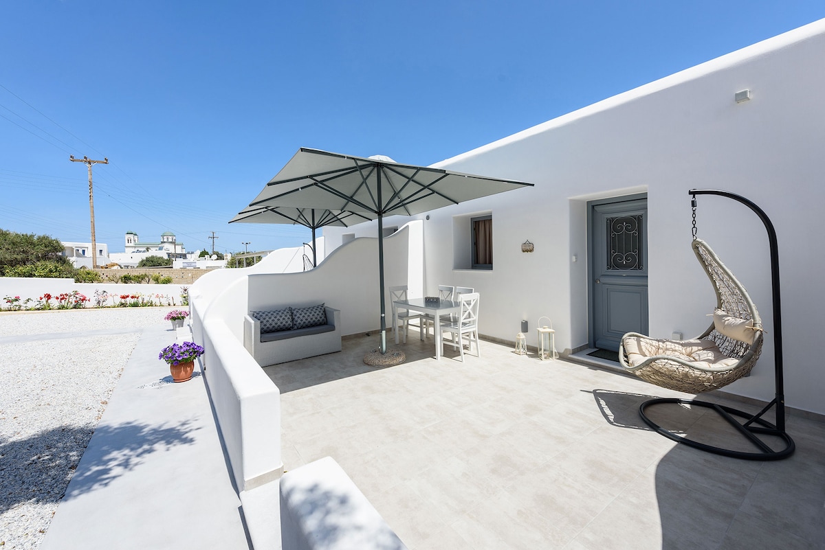 Open the sea-blue shutters and let in the cooling breeze, then whip up a snack at the urban concrete kitchen countertop at a breezy waterfront retreat. Step onto the spacious, leafy veranda for leisurely sunset drinks with unobstructed ocean views! The apartment is situated next to a sandy beach for a morning swim and a 2-minute walk from the center of Naousa and its main square. Shops, restaurants, bars, and clubs are within walking distance, yet the area is very quiet and calm!