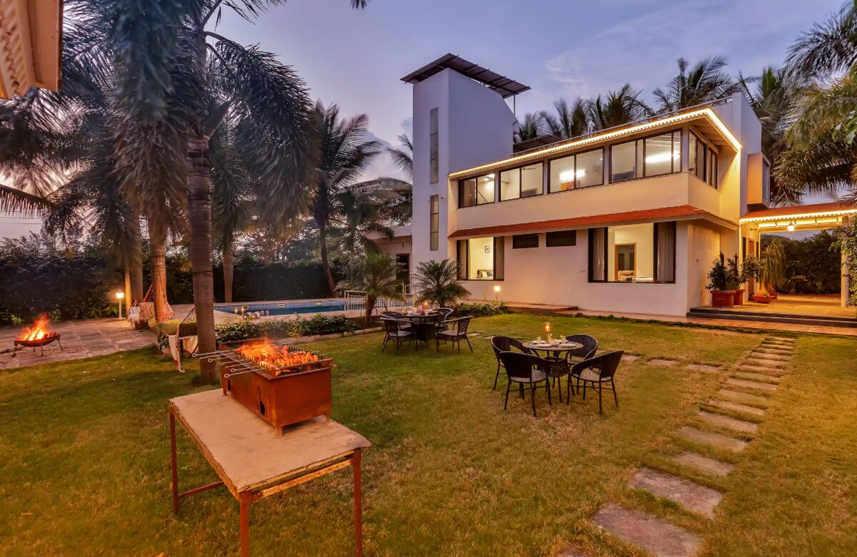 4BR-StayVista@Casa Del Verde, con piscina, césped y hoguera