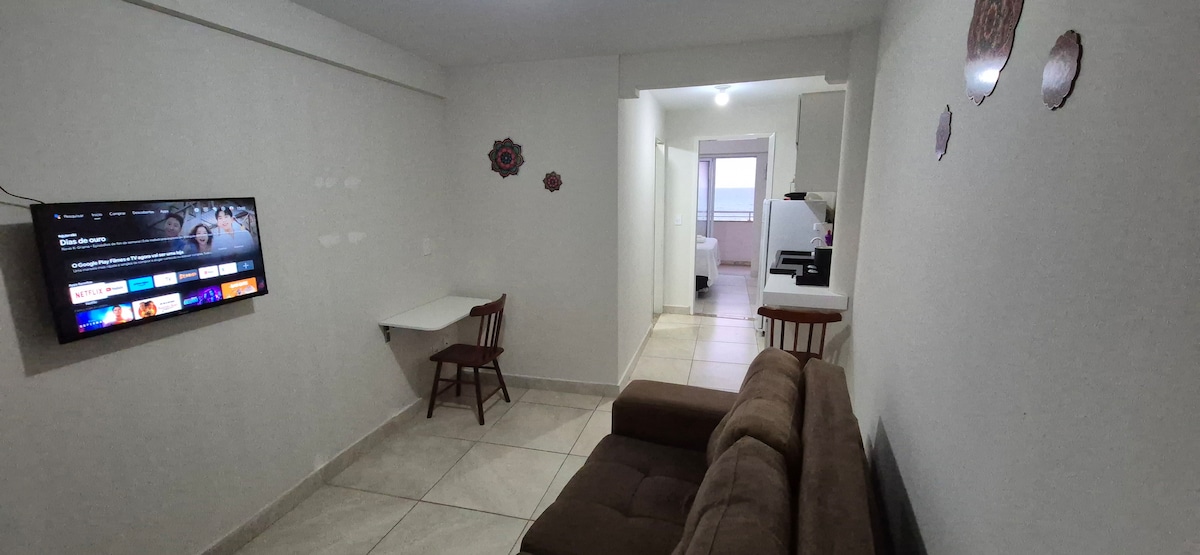 Este cómodo, moderno y acogedor apartamento de diseño cuenta con 02 en suite, cocina, cocina, cocina, sala, sala, comedor y balcón. - Habitación 1: suite con cómoda cama doble, mesita de noche y aire acondicionado. - Dormitorio 2: suite con 02 camas individuales, mesita de noche y aire acondicionado. - Cocina: utensilios de cocina (platos, cubiertos, vasos, vasos, nevera); - Sala de estar/jantar: sofá retrátil, smart TV e mesa de jantar; - Balcón:02 sillas; ropa de cama y baño.