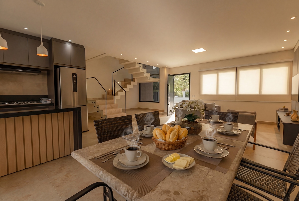 En un condominio cerrado, esta casa fue hecha por un arquitecto muy especial llamado Dedé. Es una casa excelente para amigos y familiares. ¡Perfecta para quienes les gusta cocinar, tener comodidad y admirar uno de los paisajes más bellos del mundo! Pasé muchos de los mejores momentos de mi vida aquí. Tiene una poesía propia. Necesitas experimentar para sentir lo que estoy tratando de describir aquí. Soy sospechosa, lo sé, pero recomiendo la experiencia. La casa también es el escenario del libro El Encantador de Personas. =)