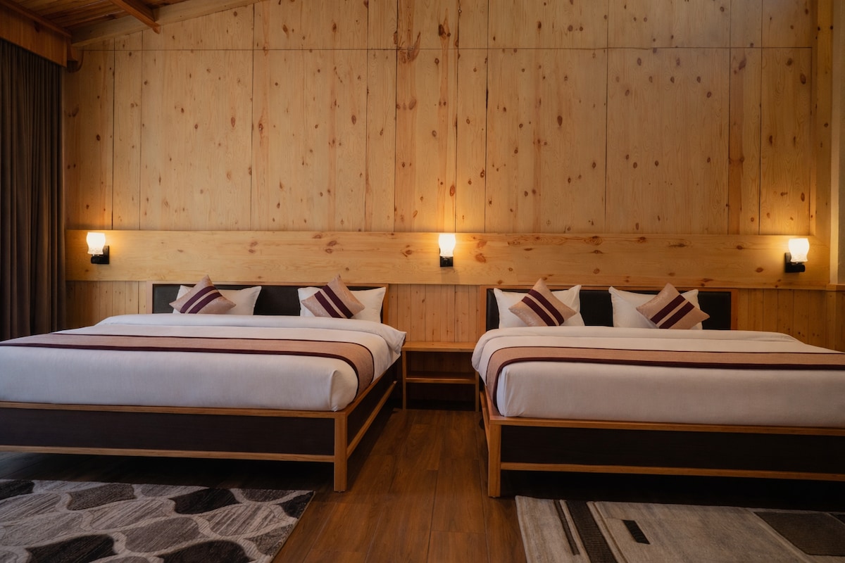 La suite Luxury Attic es un santuario espacioso y lleno de luz diseñado para viajeros que buscan intimidad y elegancia. Con techos de madera inclinados, texturas en capas y un balcón privado con vistas al valle, invita a largas mañanas, tardes lentas y reflexiones tranquilas. Cada detalle, desde la cuidada decoración hasta la suave luz de la montaña, crea un nido de serenidad. Ideal para parejas o solteros, esta suite combina una comodidad refinada con el encanto atemporal de la quietud de la ladera de Ramgarh.