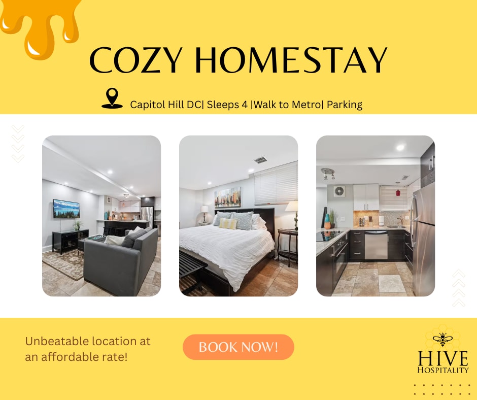 ¡Realmente no hay mejor ubicación en la ciudad! El apartamento es un sótano inglés luminoso y espacioso con mucha luz natural y dos entradas privadas. Las comodidades incluyen cocina pequeña, cafetera Keurig, baño privado completo, acogedora sala de estar, cama tamaño queen en el dormitorio y un sofá cama de espuma viscoelástica tamaño queen en la sala de estar. Camina hasta el histórico Eastern Market para comprar alimentos únicos y antigüedades. A poca distancia a pie del metro o a 12 manzanas del Capitolio. Coge el metro hasta la Casa Blanca/Smithsonian.