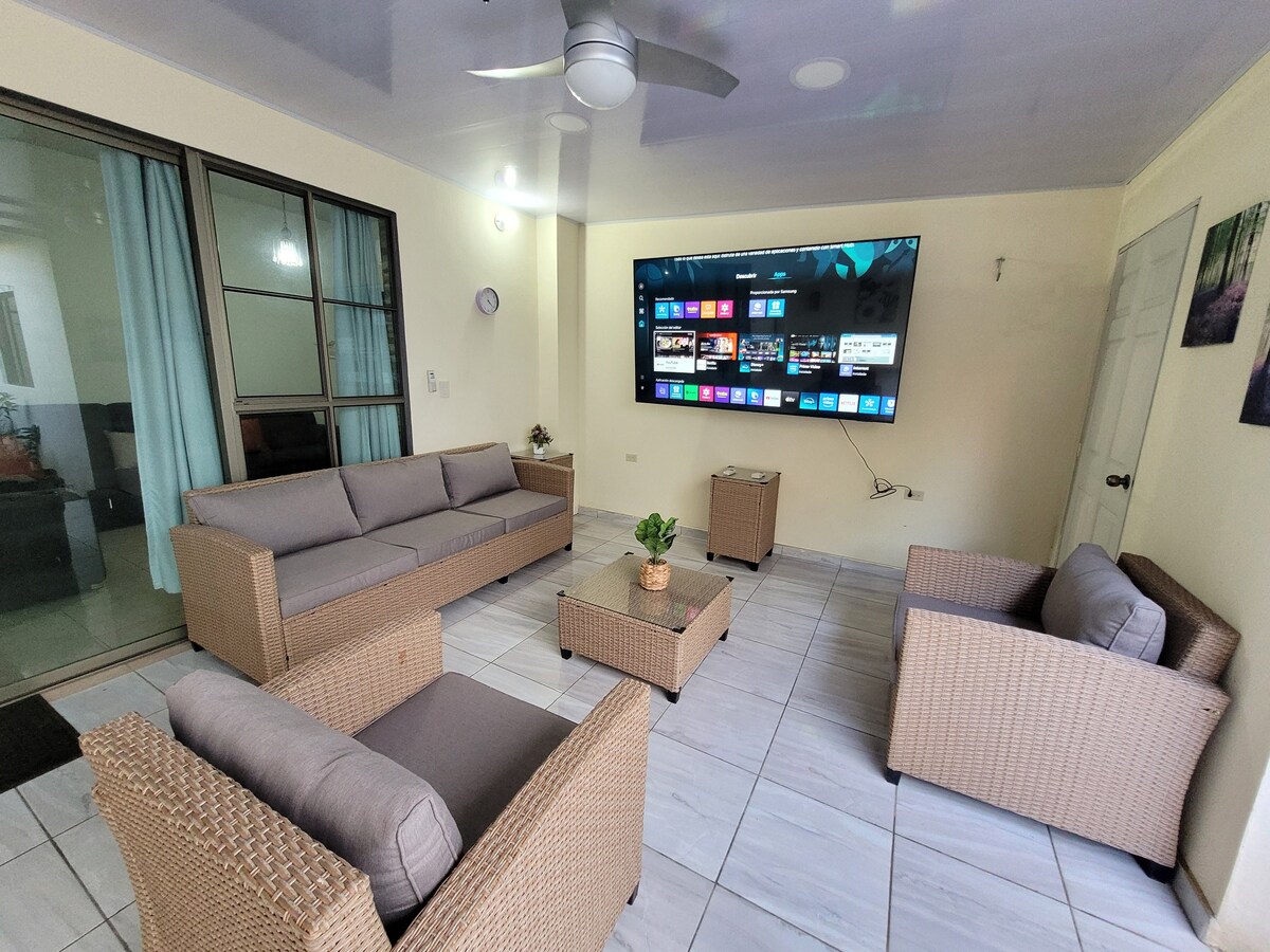 ¡Relájate con toda la familia en este tranquilo paraíso! Disfruta de todo el alojamiento para ti solo, con muchas camas, hamacas y acogedoras zonas de estar para relajarte. En temporada, sírvete de cocos frescos, mangos, plátanos o papayas de nuestro patio trasero. Estamos a solo 5 minutos a pie del parque central, el mercado de la ciudad, cafeterías, restaurantes y tiendas, o a 3 minutos en mototaxi del parque acuático cercano. A solo 30 minutos del Parque Nacional El Boquerón y del Estadio El Mágico.