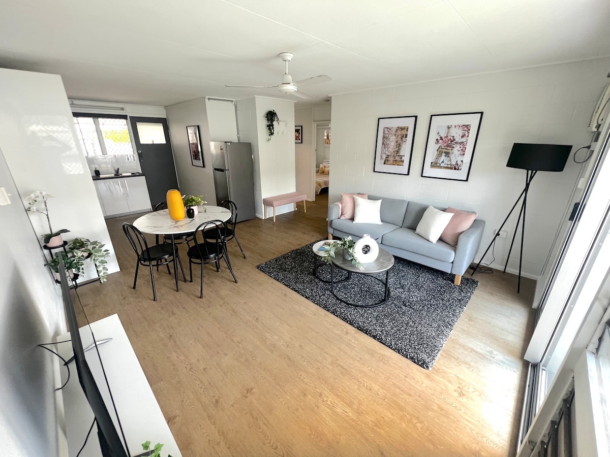 Suite para huéspedes de 2 dormitorios totalmente independiente que ocupa toda la mitad delantera de una casa de una sola planta en Annandale, Townsville. A 5 minutos de la Universidad James Cook y del Hospital Universitario de Townsville. Techos altos, mobiliario moderno, entrada privada, salón, cocineta y un patio para tu uso exclusivo. Aire acondicionado y lavandería incluidos. Baño en suite con acceso desde la habitación 1. Disfruta de acceso a una piscina compartida, un gimnasio funcional, una barbacoa al aire libre y wifi de alta velocidad para una estancia cómoda y relajada.