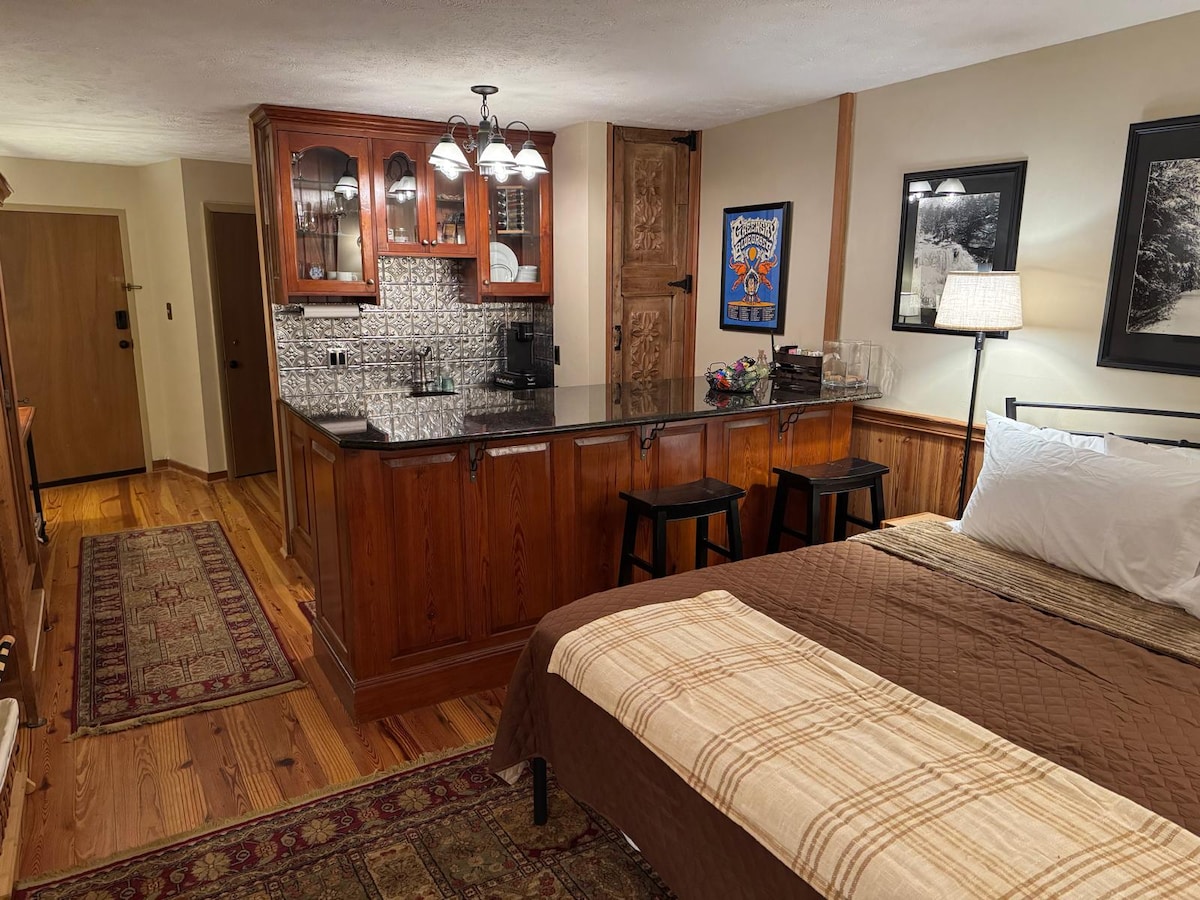 Acogedor apartamento de 1 dormitorio en Wintergreen ⛷️❄️ A 5 minutos a pie de las pistas de esquí, el pueblo turístico y el mercado de montaña, con snow tubing a solo minutos de distancia. Disfruta de una cocina totalmente equipada, café y tés de primera calidad, aceites de cocina y especias. Relájate junto al fuego de leña y disfruta de una televisión inteligente, wifi rápido y juegos. Cómoda cama tamaño queen en el dormitorio y nuevo sofá cama tamaño queen en la sala de estar. Patio privado amueblado con vistas tranquilas a los bosques y acceso cercano al pueblo para el après-ski.