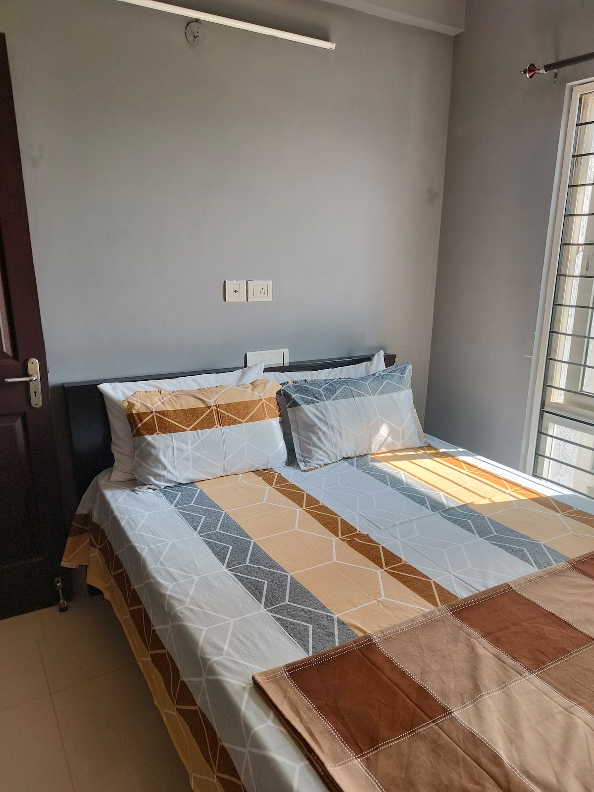 La casa se encuentra en una zona segura y lejos del bullicio de la ciudad y enclavada en los suburbios de la autopista de la tecnología. Tiene amplias ventanas y 2 balcones. Es muy espaciosa y muy relajante. Mucha luz solar y gran flujo de aire. Todos los servicios necesarios están disponibles, incluyendo TV inteligente, nevera, lavadora, horno microondas, wifi de alta velocidad, CCTV, etc. Te sentirás como en un hogar lejos de casa.