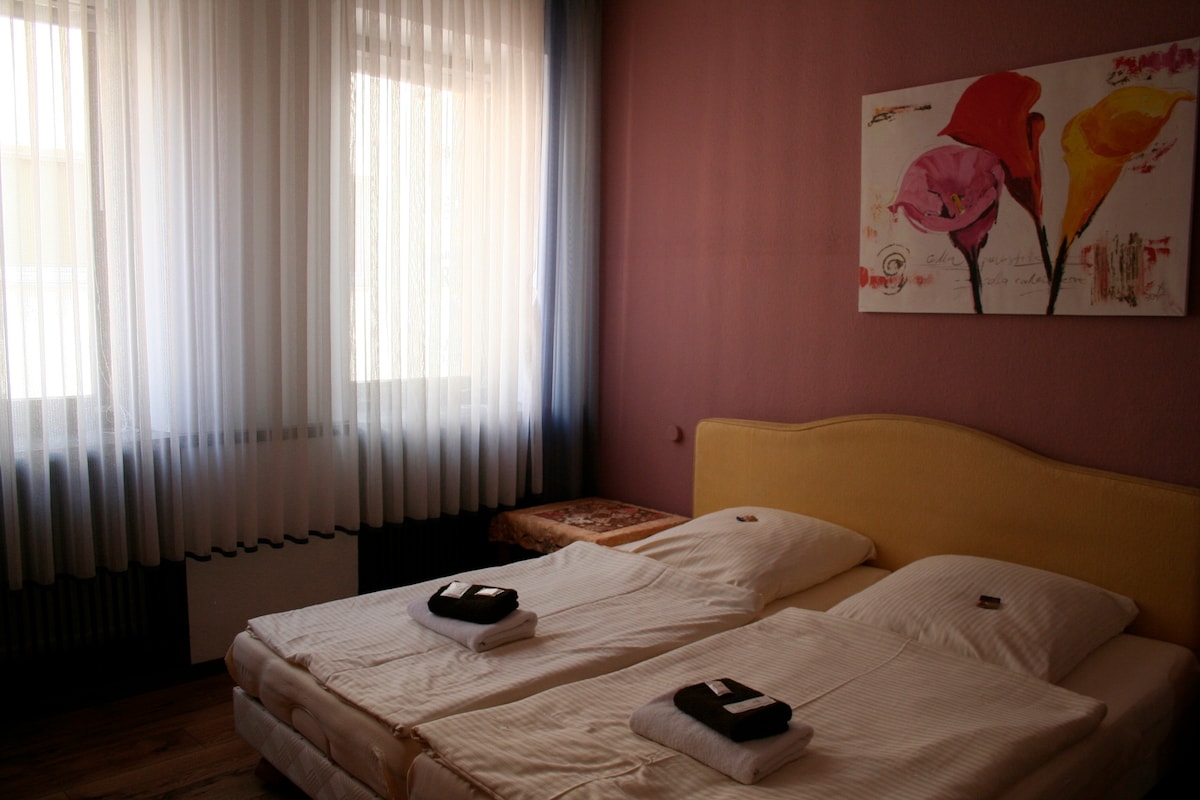 Unsere ca. 20 m² großen, hellen Zimmer überzeugen mit bodentiefen Fenstern, Klimaanlage, Verdunklungsvorhängen und Sat-TV mit Sky. Ausgestattet mit Sitzgelegenheit, Schreibtisch, Leselampe, Doppelbett (2×90×190), Kofferboy, WLAN sowie Bad/WC mit Dusche oder Wanne und Kosmetikspiegel bieten sie hohen Komfort. Jedes Zimmer ist individuell gestaltet. Babybett-Aufbettung möglich. Frühstück ist inklusive