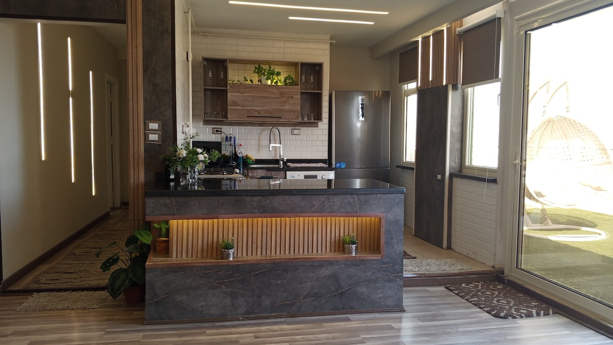 Un APARTAMENTO ENTERO con un jardín trasero situado en una zona hermosa y verde en una comunidad pacíficamente integrada que satisface todas las necesidades de los residentes. Las habitaciones están recién amuebladas, con aire acondicionado, TV inteligente y todas las comodidades que puedas necesitar, superLIMPIO y TRANQUILO. El apartamento está a 25 minutos del Aeropuerto Internacional de El Cairo. Cafeterías, restaurantes, supermercados y farmacias están cerca. Calidad de hotel con comodidad hogareña ofrecida a un PRECIO RAZONABLE.