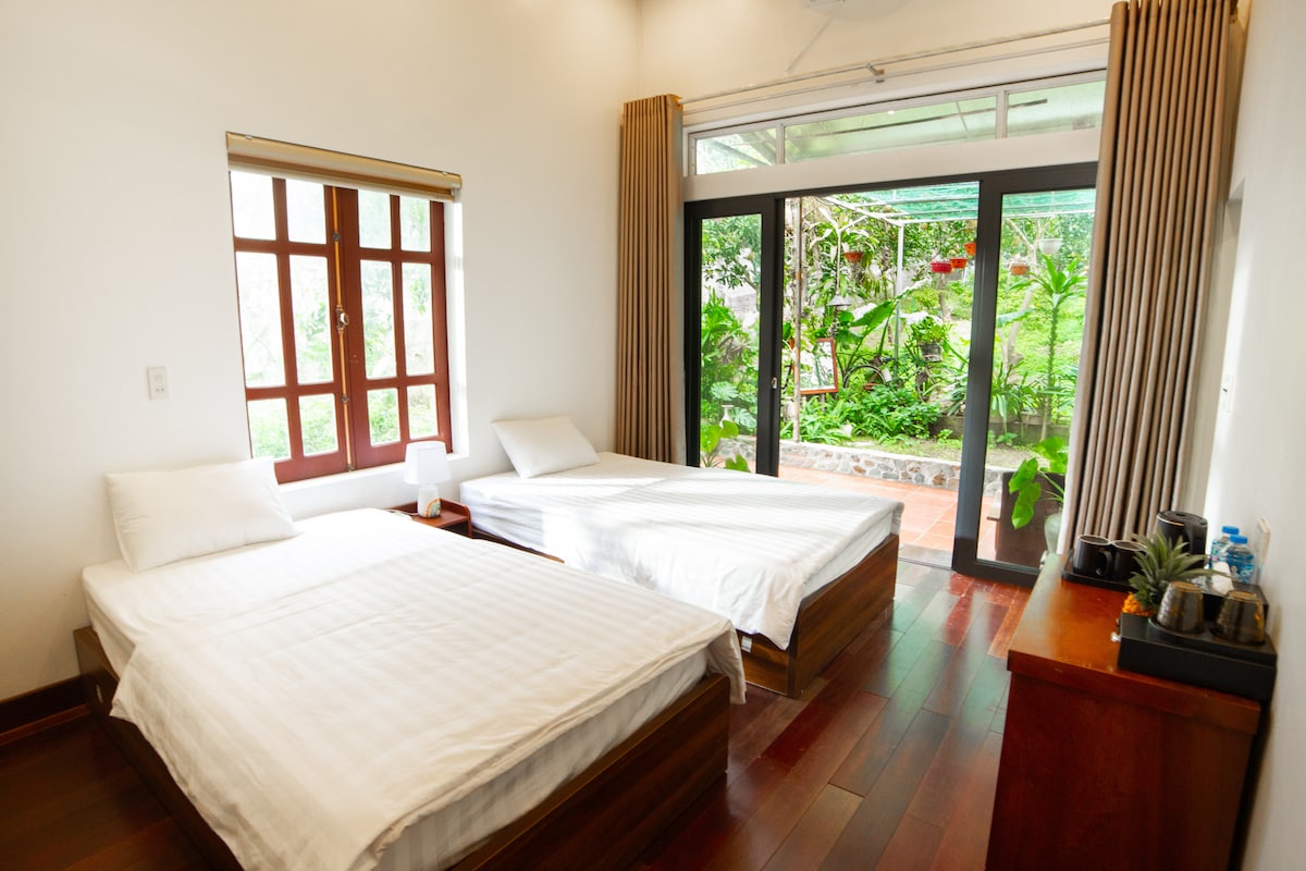 Escápate a nuestro encantador bungalow doble en Ninh Binh Family Homestay, diseñado para la comodidad y la tranquilidad. Este acogedor refugio ofrece una mezcla perfecta de comodidades modernas y encanto tradicional vietnamita, por lo que es una escapada ideal para parejas. Disfruta del ambiente sereno de nuestros exuberantes jardines y date un refrescante chapuzón en la piscina. Disfruta de la cálida hospitalidad de nuestra familia y explora las atracciones cercanas como Bai Dinh, Trang An, Hang Mua, Tam Coc, la antigua capital Hoa Lu y el parque Cuc Phuong.